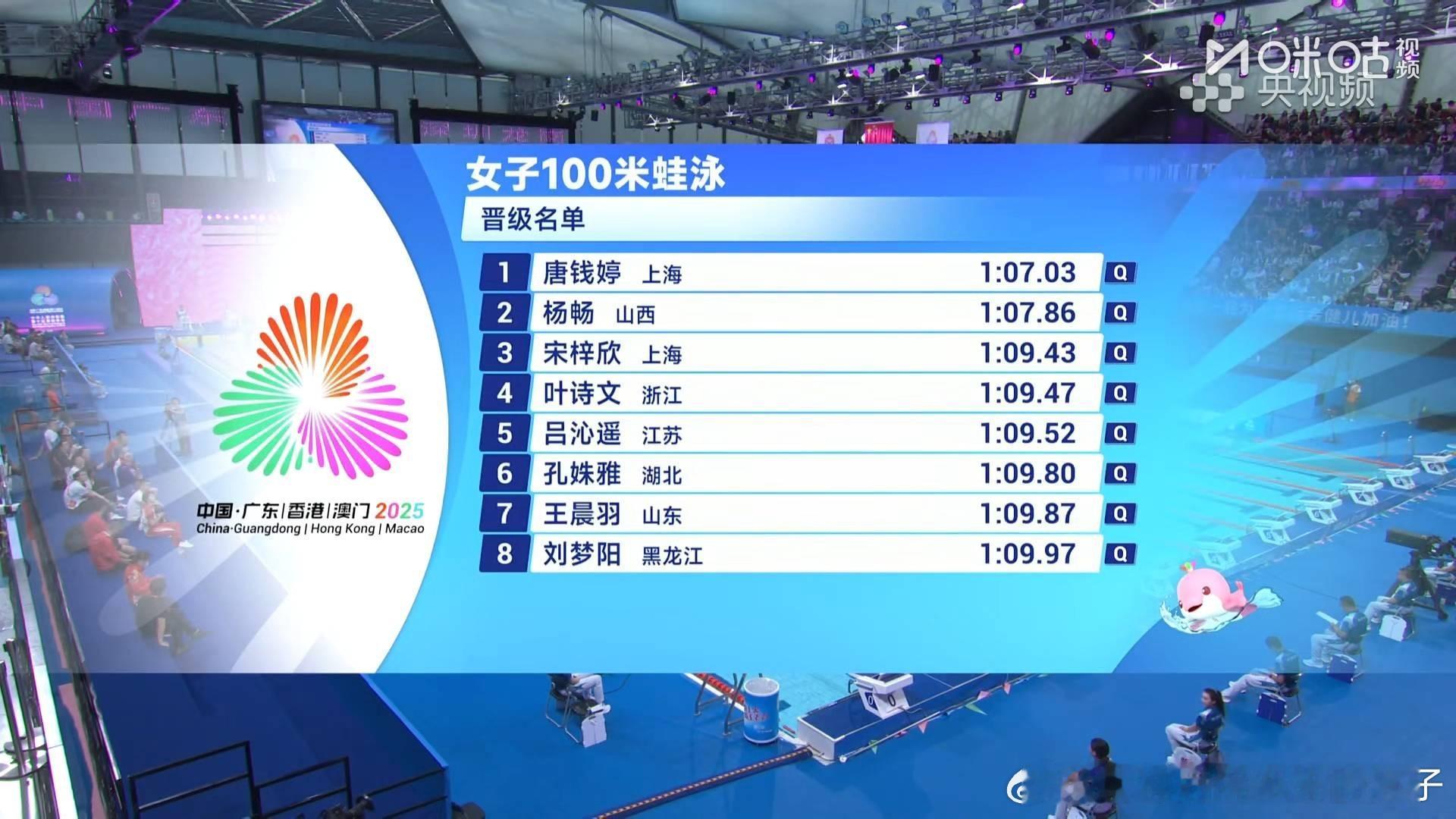 2025年第十五届全运会游泳女子100米蛙泳预赛:唐钱婷上海1:07.03