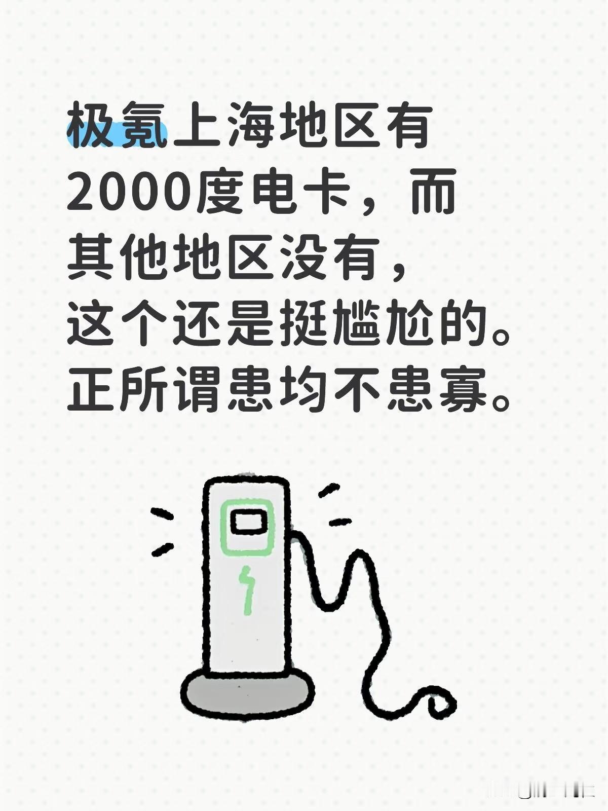 极氪上海地区有2000度电卡,而其他地区没有,这个还是挺尴尬的。正所谓患均不患寡。