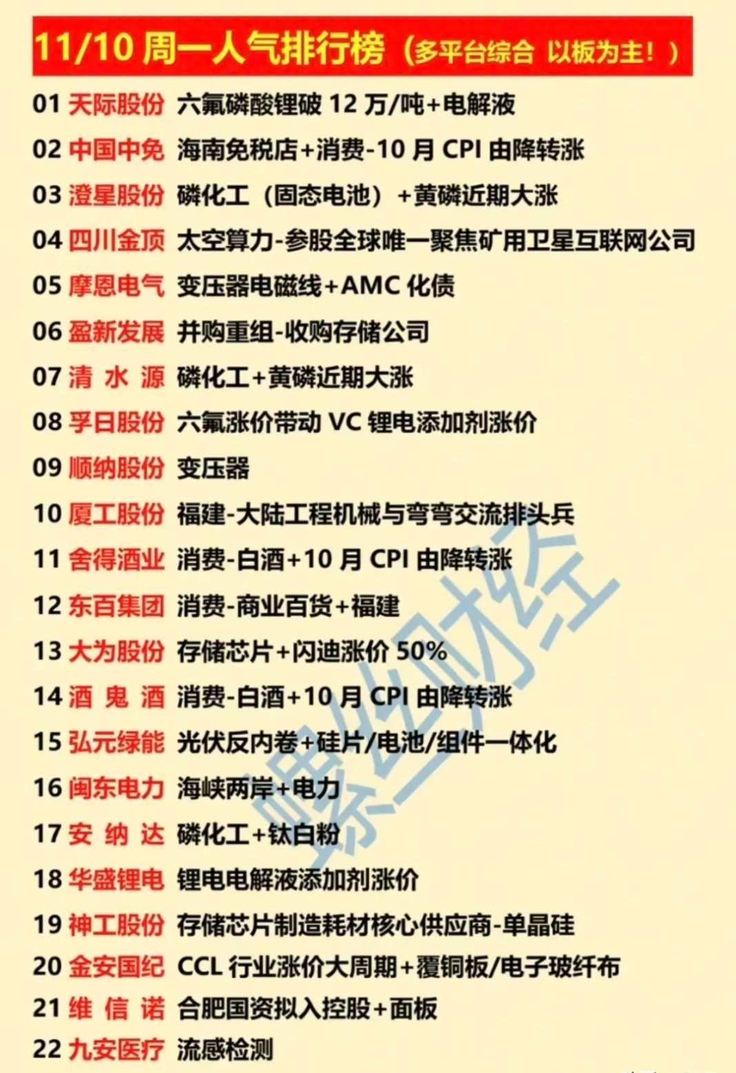 11/10周一A股人气股TOP22深度解析:题材与涨价双轮驱动市场热点