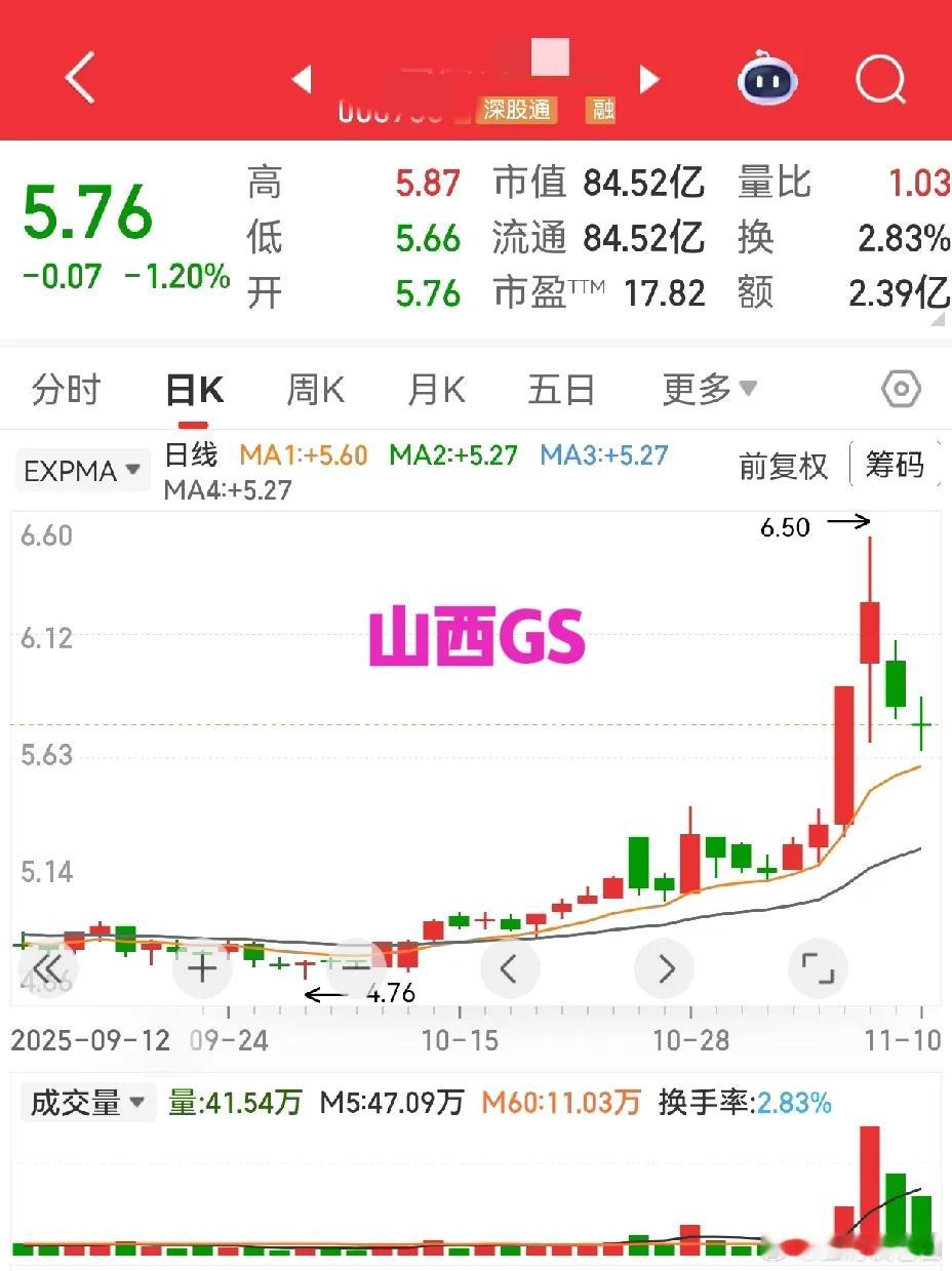 山西GS,涨停后回调三天,这三天的回调是逐渐缩量的,虽然这三天看上去是一个连续回落的状态,实际上第一天并不是回调,第二天的回调幅度比较大,第三天是个十字星,正好与生命线距离不远了。