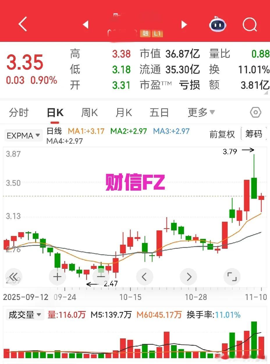 财信FZ在涨停之后开启调整,近两日的K线形态与揉搓线有相似之处,但并不标准。