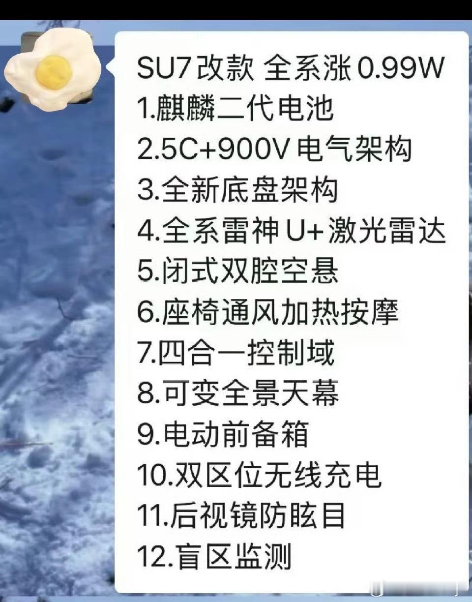 小米SU7改款涨价近1万小米新款SU7曝光了,目前网上传言说是要涨价一万,但是我看了一下这些配置,其实对于20万以上的车来说,现在都逐渐开始标配了,所以我感觉有可能价格只会微调不会大变的大v聊车