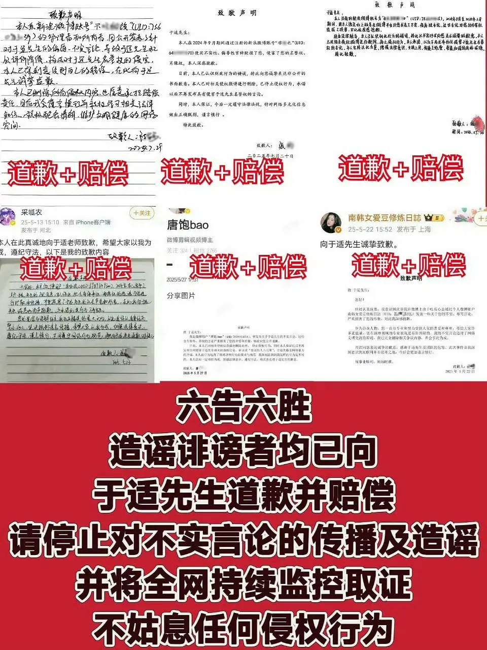 于适工作室全平台告黑,在此之前已六告六胜,均道歉赔偿