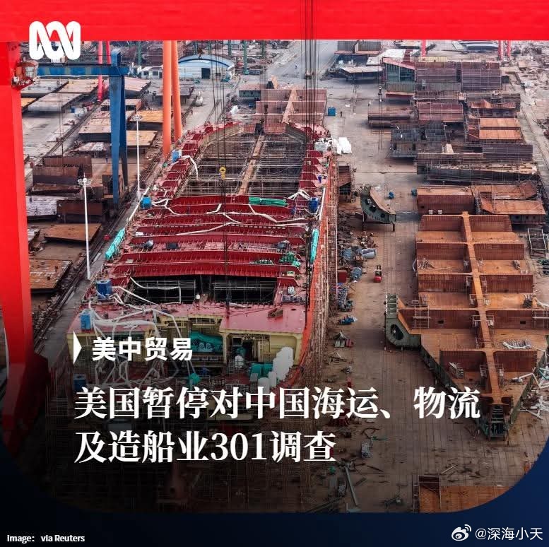 美国贸易代表办公室周日表示,将暂停针对中国在海运、物流和造船行业的301条款调查相关措施,从美国东部时间11月10日凌晨12:01起生效,为期一年。