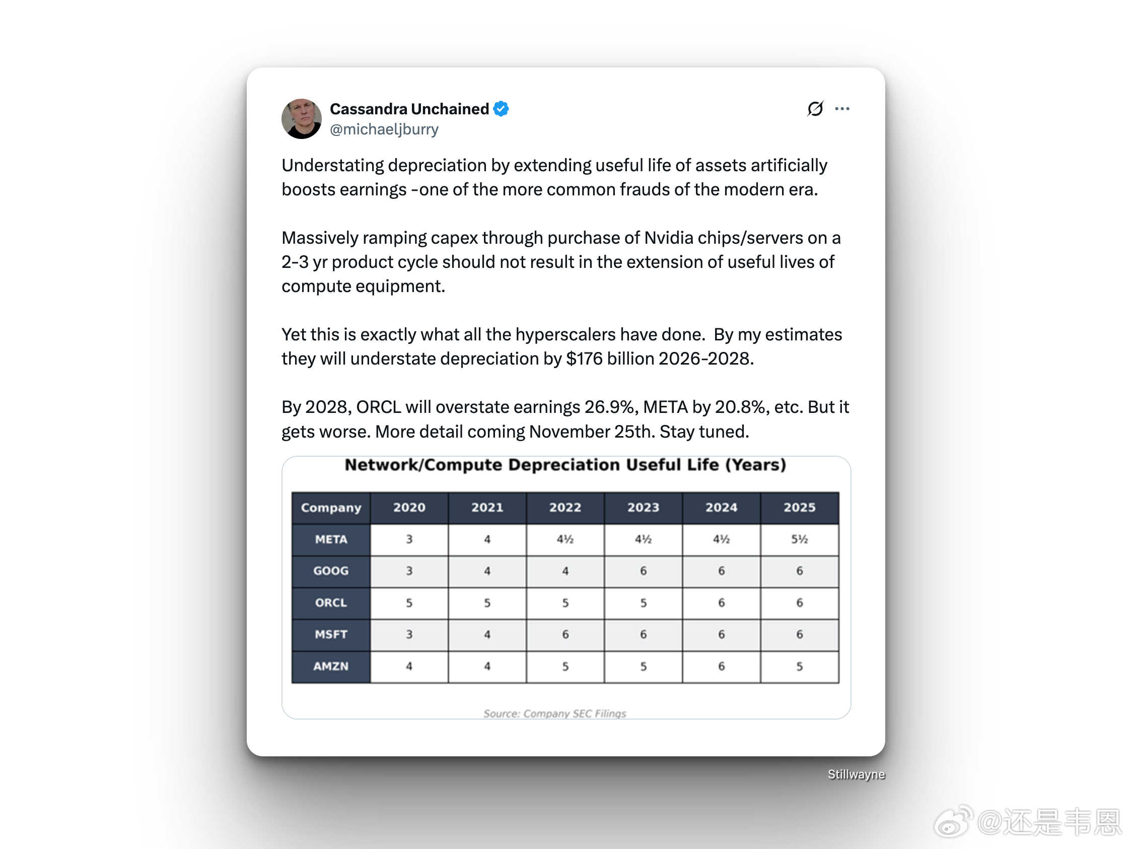 “通过人为延长资产使用年限来低估折旧费用,从而虚增公司利润,这是当代最常见的财务造假手法之一。目前各大云计算巨头都在大规模增加资本支出,购买英伟达芯片和服务器,这些设备的产品周期只有2到3年。因此,这种投资本不应导致资产使用年限被延长。