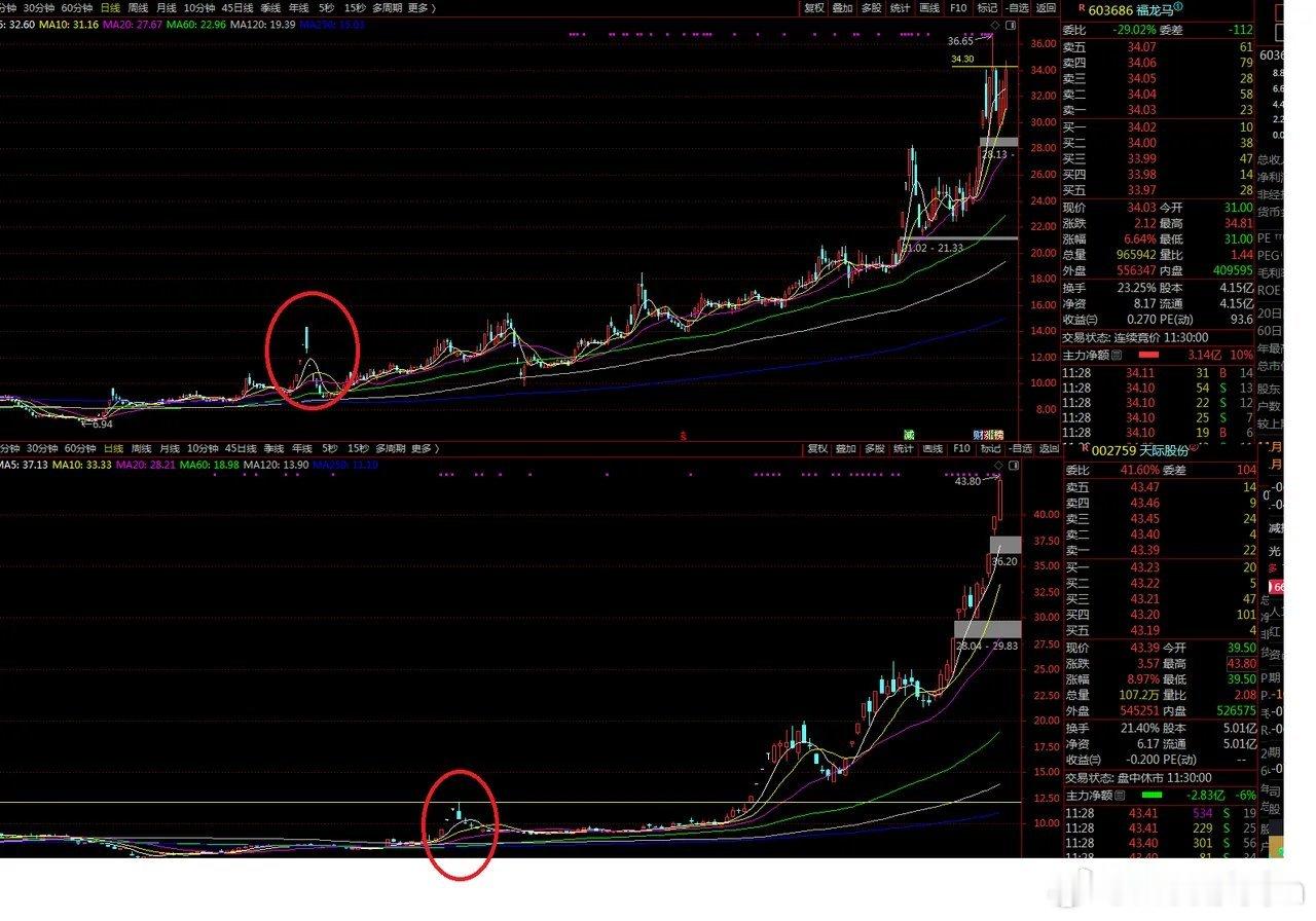 此外指数小调整,前面的一些人气股也在止跌这也成为一部分做反抽的资金的选择,如核电的安泰科技也止跌了,量子的神洲信息今天估计也是地量十字星,这些其实都是各个方向前面的抱团股,抽完估计也差不多了,主升可能还是需要继续跟踪抱团的锂电与福建系,适当观察马字辈吧,如果说锂电抱团有天际股份穿越几个周期,马字辈其实也有一匹福龙马穿越了几个周期了,真的是不比较不知道,一比较吓一跳,连这走势都差不多,如图,天际股份6月24号三连板大阴线洗盘后再次突破走了三大波,福龙马启动前也是3连板大阴线后突破后涨到现在,一个情绪的马字辈硬给炒成了趋势的感觉这也是大A神奇之处。