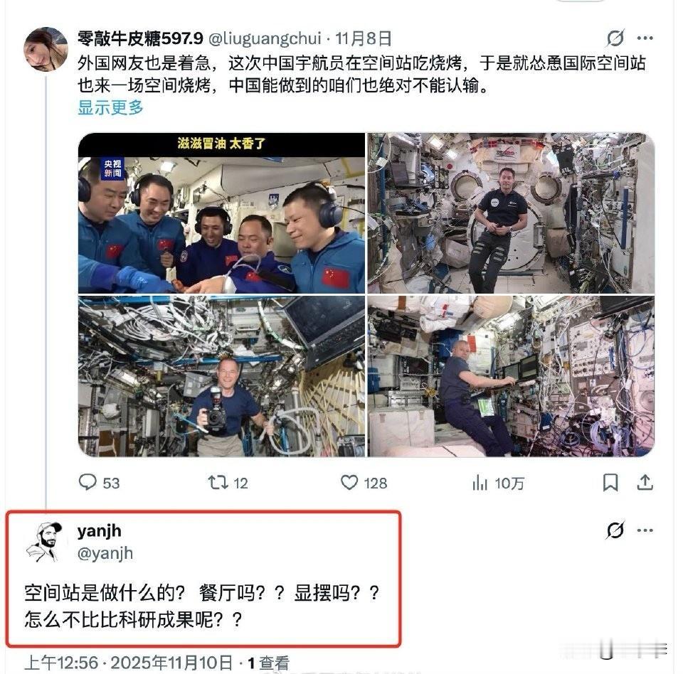有没有可能吃烧烤就是科研成果?[抠鼻]而且餐厅的确不是什么高科技,为什么他们做不到?是不想吗? 像老米之前两位宇航员孜孜不倦地科研,哪怕到点了依旧不愿下来[吐舌] 上餐桌就不要来着刷存在感了[马思纯的微笑]中国空间站故事 太空上烹饪 太空舱烧烤
