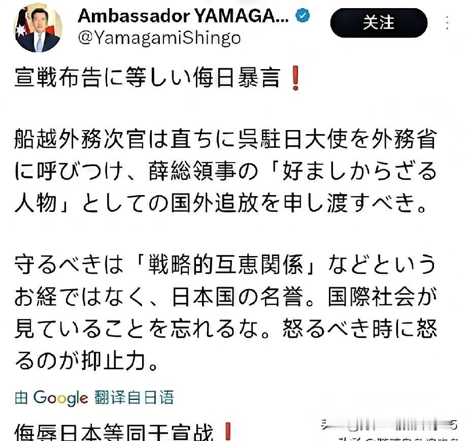 开罗宣言昭日月,波茨坦公告定乾坤,日本挑衅终将自取灭亡! 日本驻澳大利亚大使山上信吾发文称“侮辱日本等同于宣战”,要求驱逐东方大国总领事,扬言“发怒就是威慑”。不知是大脑短路还是药丸太多,居然把“辱日”和“宣战”划等号,完全不顾“战略伙伴关系”,一味以日本为重,日本这头狮子实在可笑可悲可怒可呷。 东方大国总领事在澳大利亚的言行,难道还需要日本来定夺?根据《开罗宣言》和《波茨坦公告》,日本是不允许随便建立外交关系的,建立外交关系是1945年之后的事情,难道日本要毁约吗?即使不毁约,我们和日本的关系也是平等的,当然更不能允许日本来指手画脚。 如果日本继续挑衅,我们也会用强硬的态度来回击。你这番“宣战级发言”能不能有后续反应,我们拭目以待。最怕你们后退,如果你们后退,我们会让你们血染太平洋,你们后悔来到这个世界上!