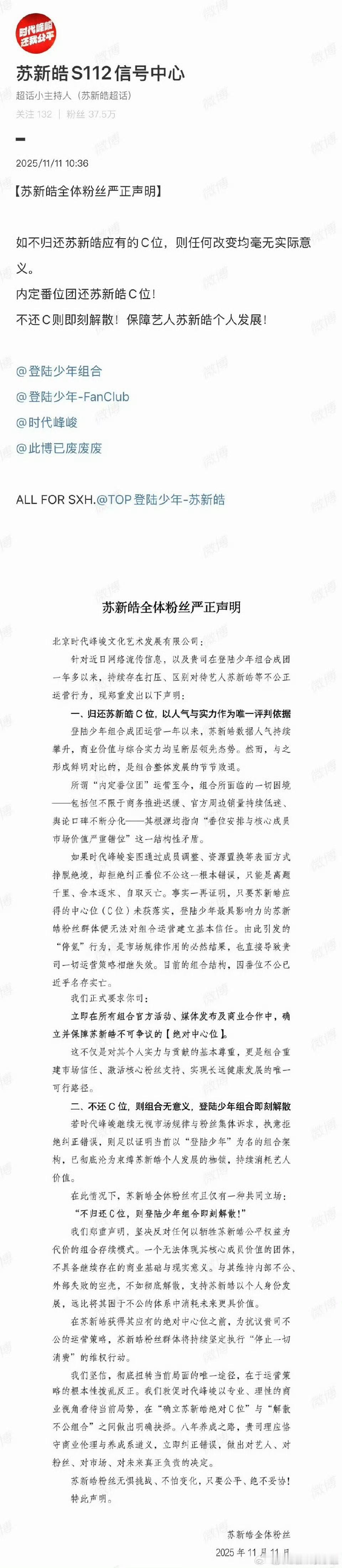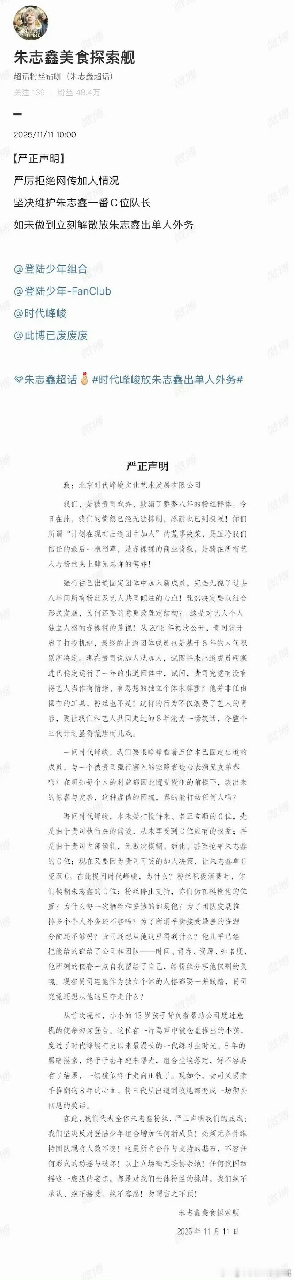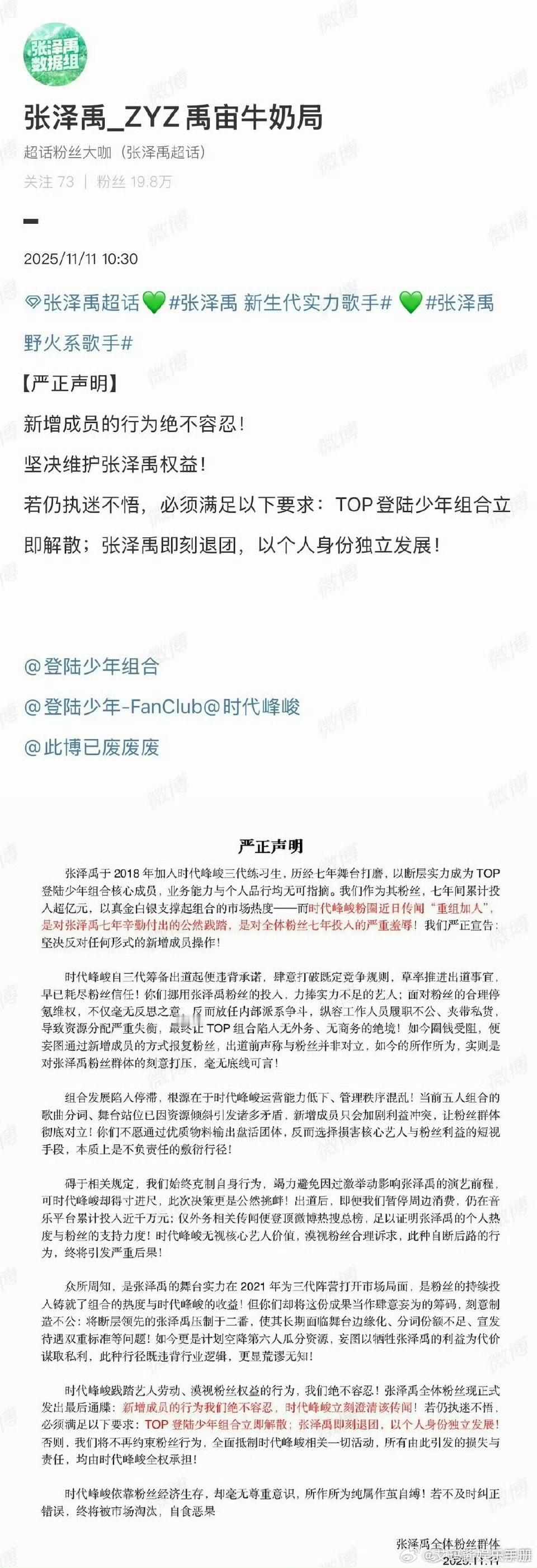 网传穆祉丞要加入TOP后,朱志鑫、张泽禹、张极、苏新皓、穆祉丞五家粉丝发布声明