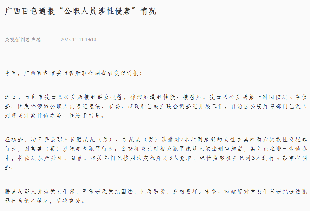 经初查,凌云县公职人员腊某某(男)、农某某(男)涉嫌对2名共同聚餐的女性在其醉酒后实施性侵犯罪行为,谢某某(男)涉嫌参与犯罪行为。公安机关已对相关犯罪嫌疑人依法刑事拘留,案件正在进一步侦办中,将依法从严处理。目前,相关部门已按照法定程序对3人免职,纪检监察机关已对3人进行立案审查调查。