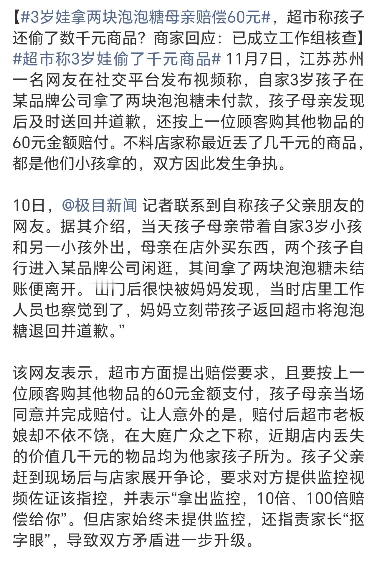 3岁娃拿两块泡泡糖母亲赔偿60元孩子母亲发现后及时送回并道歉,还赔了钱,结果店家说最近丢的几千块商品都是他们小孩拿的……