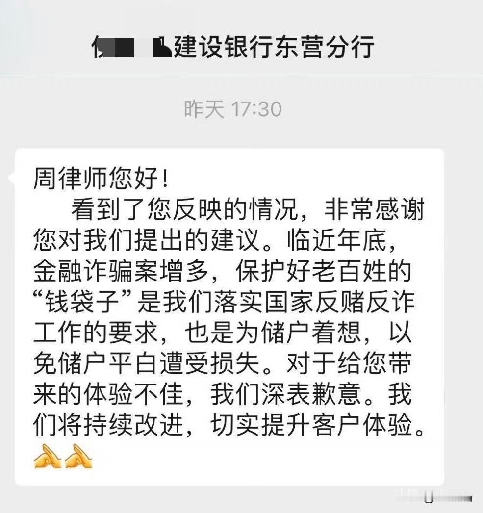 建行层层加码后续,银行道歉,周律师拒绝并控告相关银行领导。 前情回顾:11月5日,周律师到建行东营分行取现低于5万,银行追问资金用途和上月转账记录,并报警核实,周律师认为取款低于央行5万的规定,银行不该限制取款,僵持半小时,虽最后银行方改口说可以取款,但周律师放弃取款。11月6日,银行方回应:按反诈中心要求,需要核实取款用途。反诈中心回应:这是银行自己的问题。 11月9日,周律师再次发文指责,银行私自把央行规定5万的标准,层层加码,降低到1万。表示不会投诉银行基层柜员,认为柜员只是领导们瞎指挥的被动执行者,已控告相关银行领导。希望以自己的个案推动制度建设。 反诈任重道远,反诈是现行很必要的预防财产损失的手段,但市民有自己财产支配的自由,需要银行、发诈中心方面更精准的防诈预测和管控,不该是对全体市民“一刀切”盘问防控。 你支持周律师的做法吗? 冬日生活打卡季银行取款应不应该询问用途律师取款一万被盘问 银行做法合理吗