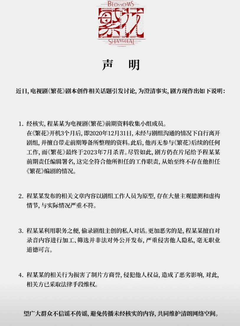 起初,部分网友还怀疑古二,觉得会不会是恶意拼接生成的录音,《繁花》剧组也是三次发声明澄清,只是,声明格式一次比一次敷衍,或许它们也觉得心虚了吧。