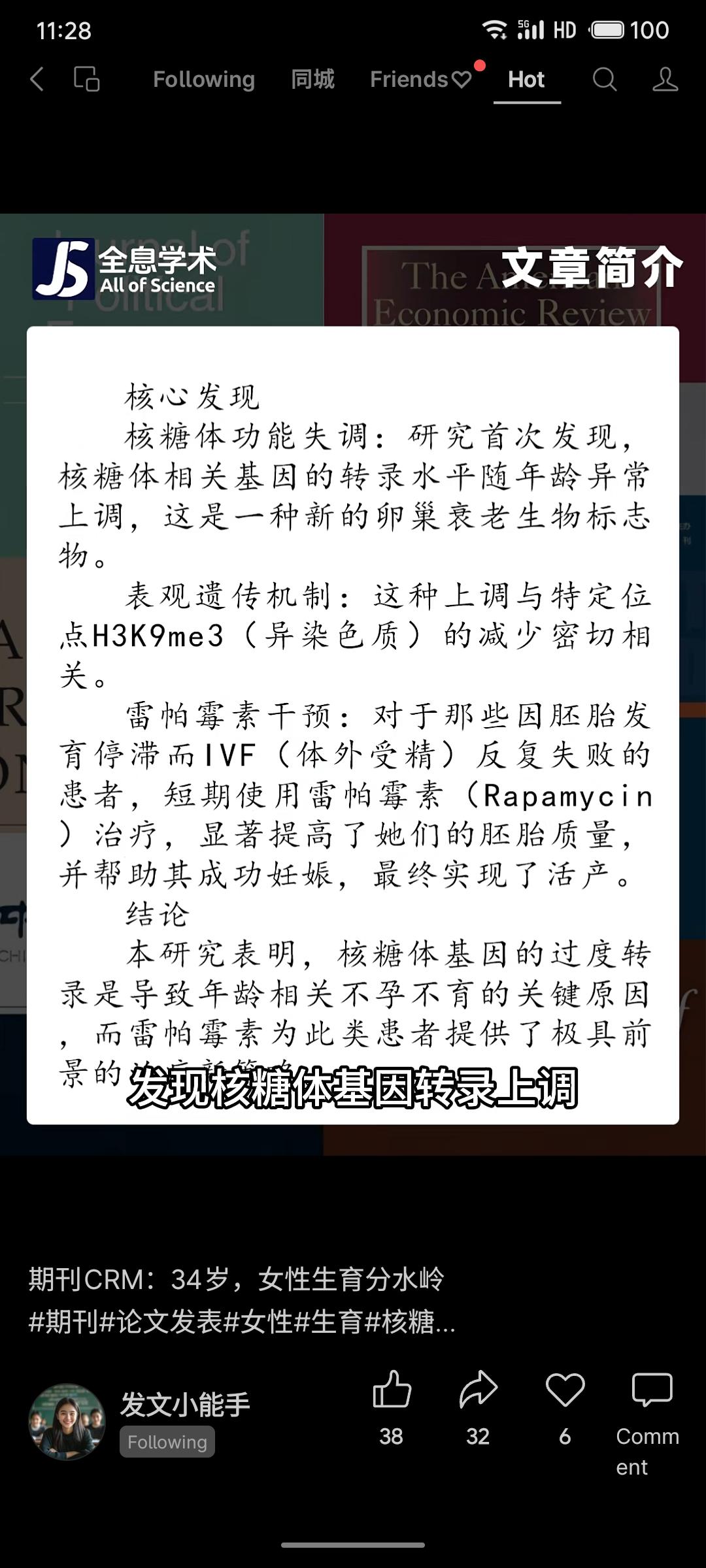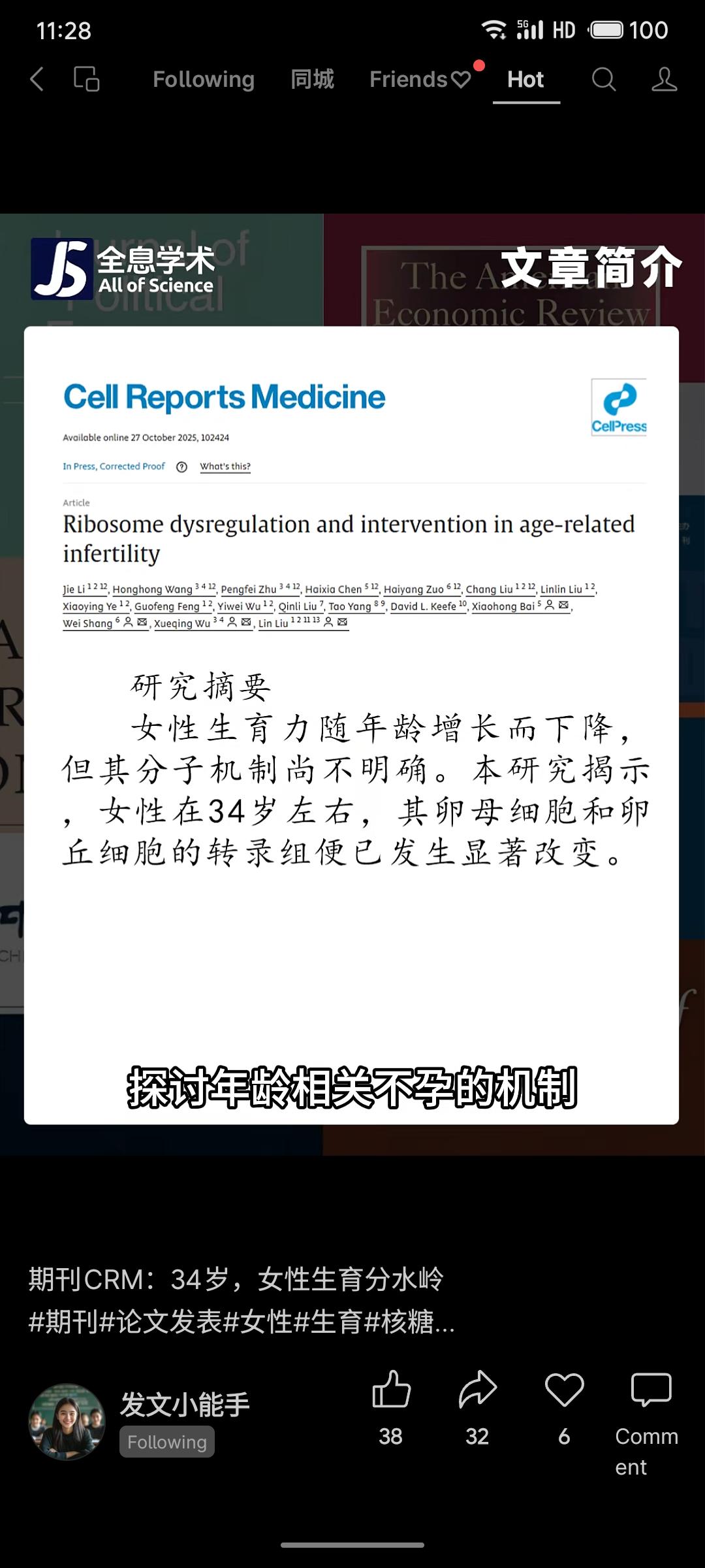 《细胞报告医学》研究揭示,女性约在34岁出现生育力转折,其卵母细胞与卵丘细胞中核糖体基因转录异常上调,并与H3K9me3减少相关。该异常提示卵巢衰老新机制。针对反复IVF失败者,短期雷帕霉素干预可提升胚胎质量并实现活产,为年龄相关不孕提供新治疗方向。