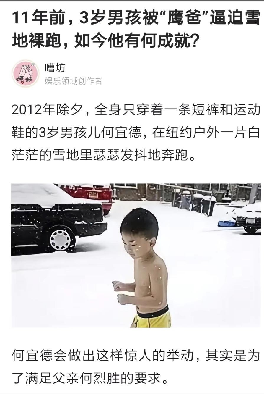 2012年的那个冬天,纽约飘着鹅毛大雪,气温降到了零下13度,一个4岁的小男孩何宜德,身上就只穿着一条短裤,在雪地里拼命奔跑——这段视频发到网上后,一下子就炸开了锅。网友们纷纷骂“鹰爸”何烈胜是虐待孩子,可很多人不知道,这背后藏着一个早产儿爸爸,为了救孩子,赌上了所有的“疯狂”举动。 医生当年说孩子可能会落下脑瘫的毛病,何烈胜偏不信命,硬是用各种“魔鬼训练”一点点创造了奇迹:5岁就能开飞机,到了8岁就考上了南京大学,15岁就成了剑桥大学的博士后。现在18岁的何宜德,每天在实验室里研究人工智能,平时没事的时候还会看看科幻电影放松一下。 当年那个被雪粒子打得脸蛋通红、冻得嘴唇发紫的小身体,现在已经成了冉冉升起的学术新星,浑身散发着光。总有人说虎爸教育把童年给毁了,但每次看到他健康又自信的笑脸,谁还能说这到底是对是错呢? 教育的底线到底在哪儿?或许就像老鹰教小鹰学飞那样,有些成长啊,总得经历点风雨才行。你还记得那段让人心揪的雪地奔跑视频吗?或许,这就是成长的另一种模样吧。