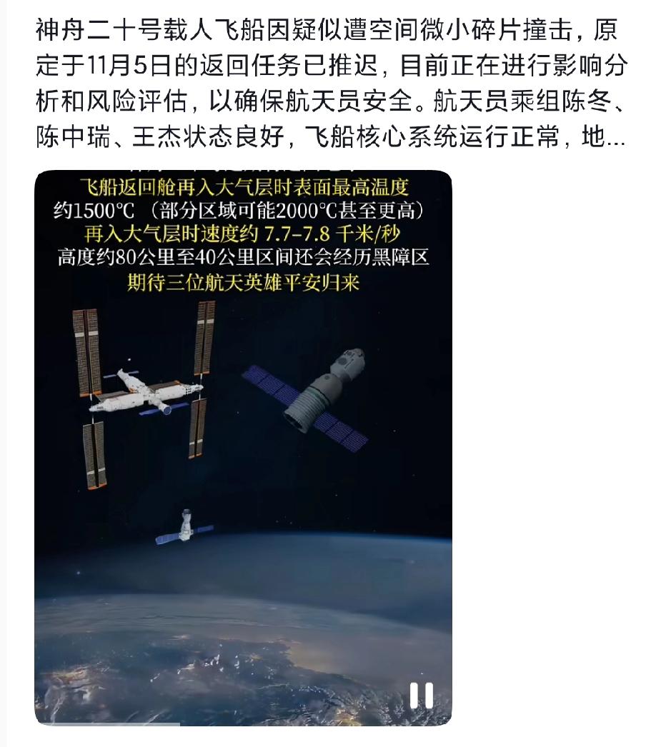 神舟二十号返回时被太空垃圾“撞了一下腰”!三名航天员的返程不得不往后延,这事儿背后的情况真让人心里一紧。 你可能想不到,就像高速飞行的子弹一样,毫米级的太空碎片其实杀伤力极大!神舟二十号在回家的路上,突然被一个不请自来的“访客”袭击,服务舱的外壳被砸出了个小坑。专家们赶紧凑一块儿研究,发现这枚太空垃圾可能是之前报废卫星解体后产生的碎片,飞行速度快到每秒好几公里,比子弹还猛。 好在熊猫空间站其实早有准备,身上的多层防护盾帮了大忙,这次撞击才算有惊无险。不过陈冬他们这几个航天员就得在太空里多待上几天了——因为地面上14个单位正拿着3D打印补片这些新科技,给飞船做“全身大检查”呢。要知道,以前俄罗斯的飞船就被类似的碎片砸过,当时舱里温度一下子就蹿到了50度! 现在近地轨道上飘着的太空垃圾,已经有上亿块了,熊猫空间站每年都得变轨机动20多次来躲这些垃圾。这次事件又给我们提了个醒:咱们人类自己制造的太空污染,这就开始反过来“坑”人了。好在咱们早有准备,一直有两艘救援飞船在那儿候着,随时能出发。 看着航天员在空间站里该干嘛干嘛,一点儿都不慌的样子,真得说一句:就是因为他们这么严谨又淡定,才能一次次把危险变成平安。那你觉得,以后该怎么清理这些太空垃圾呢?是用激光扫掉,还是派人去抓回来回收