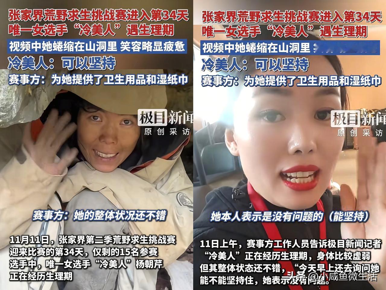 冷美人就这样退赛也挺好的! 她一个弱女子能坚持到半决赛,从一定程度来说,她已经算赢了。 在这次张家界七星山荒野求生比赛中,冷美人作为唯一一名女性选手,她如今面临的处境不是庇护所损坏,也不是没有火种,而是她的生理期即将要来了。 一个女性在连续下雨的潮湿环境下,没有火种取暖,营养也跟不上去,生理期的她很难坚持下去的。 网友看到她状态,都在喊话让她退赛,并不是小看她,而是出于对她的关心。 但冷美人很坚强,她说自己还可以坚持,不打算放弃。 赛事方也考虑到她生理期的情况,会为她提供卫生用品和湿纸巾,这也是不幸中的万幸,就看她能不能坚持到决赛。