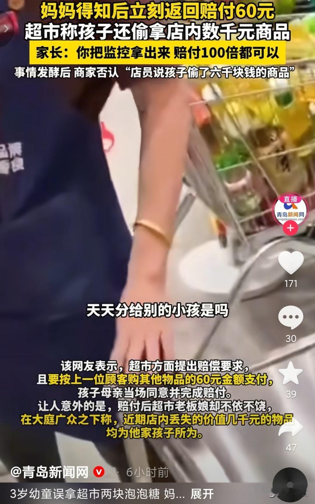 本想给孩子上一课, 没成想被“好想来”超市上了一课。 发现自己孩子拿了“好想来”2个口香糖,母亲带孩子回去赔偿了60元。 店员的神奇操作就来了,说店里面丢了几千块钱的商品,还教训孩子:“小时候偷针,大了就偷金”,几千块钱在“好想来”都得开三轮拉,三岁孩子拿得下。 父亲没有和她争吵,要求提供监控录像,情况属实,愿意10倍百倍赔偿,这位店员在没有任何证据的情况下说,他把偷出去的东西分给了其他小孩子吃,声音依旧很大,仿佛自己是受害者,你竟然看到了,为什么不阻止,事后在这里胡搅蛮缠,安的什么心思。 客客气气跟你说话,真当对方是软柿子,发现跟她沟通有障碍,果断报警,三岁小孩偷几千块的东西,先不说谁家小孩子三岁单独出来逛商场,几千块的零食那得多大一堆,一天偷10块,从两岁开始偷,而且还天天不间断,不被发现。 家长已经很好了,知道孩子拿了马上返回超市给了钱,积极赔偿,孩子小也是一时不懂事随手拿了东西,家长已经及时纠正了,但是超市工作人员有点不依不饶了,这次教训给三岁的孩子留下了深刻的印象,以后肯定不会再乱拿别人的东西了。
