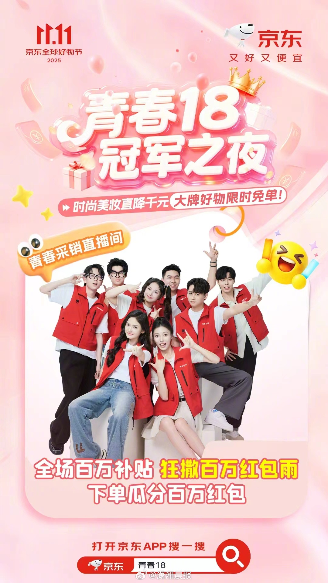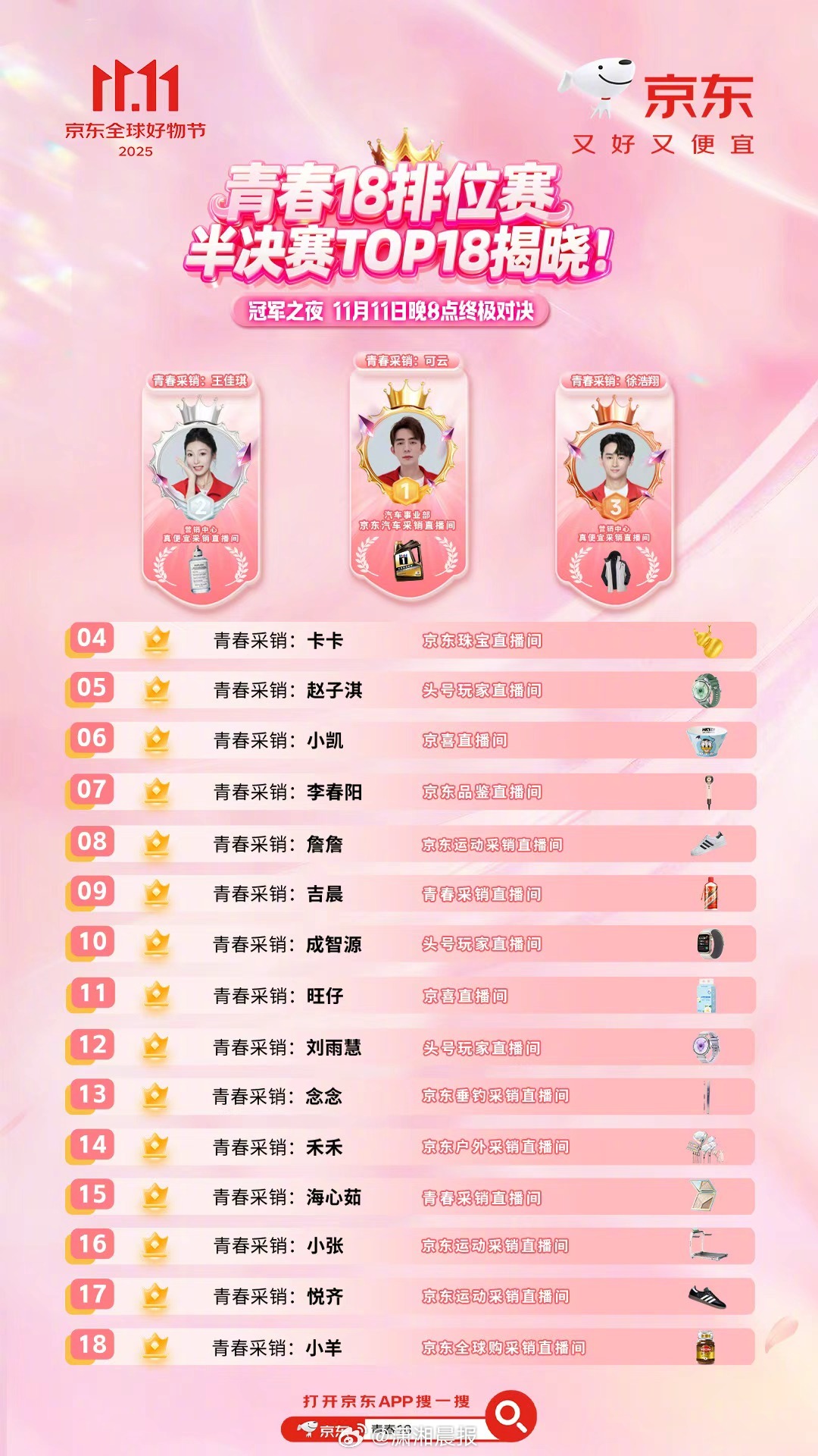 【京东主播的一哥一姐今日要放榜了!】起猛了,。京东所有全职主播都参与的《青春18排位赛》,从10月14日启动,持续覆盖双十一。这次的主播都是用户投票选出来的,就在双十一选出冠亚季军。小编看了一下名单,实力强,竞争大!有曾在《我的阿勒泰》出演角色的00后女演员海心茹,还有从事过纪录片导演、人力、秘书等工作的六边形战士子淇……品质与价格双内卷!00后主播们付出诸多努力,力争用实力赢得消费者的认可。