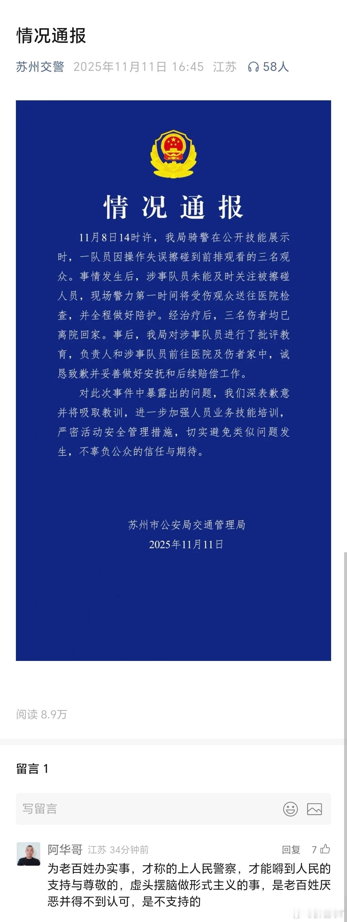 憋了两天,苏州终于还是道歉了。11月11日下午,苏州交警发布警情通报称,11月8日14时许,该局骑警在公开技能展示时,一队员因操作失误,擦碰到前排观看的3名观众。通报称,事情发生后,涉事队员未能及时关注被擦碰人员,现场警力第一时间将受伤观众送往医院检查,并全程做好陪护。经治疗后,三名伤者均已离院回家。通报表示,该局事后已对涉事队员进行了批评教育,负责人和涉事队员也已前往医院及伤者家中诚恳致歉,并妥善做好安抚和后续赔偿工作。通报最后强调,对此次事件中暴露出的问题,他们深表歉意并将吸取教训,进一步加强人员业务技能培训,严密活动安全管理措施,切实避免类似问题发生,不辜负公众的信任与期待。据观察,该份警情通报,目前仅发布在苏州交警的👸号上,微博平台暂时未同步相关内容。