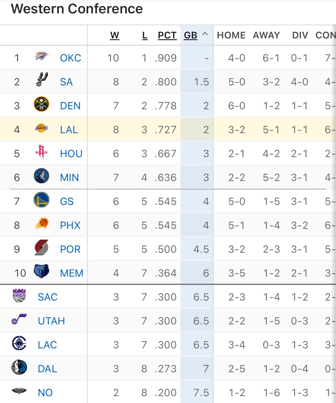 西部排名情况,湖人8胜3负第四。
