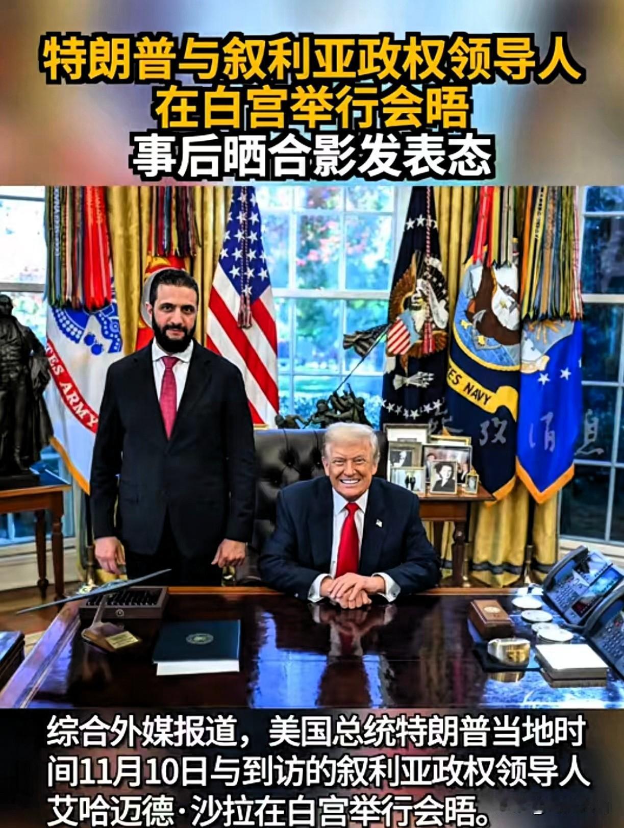 沙拉乖乖站在主人座位侧边,随时准备听候吩咐 2025年11月10日,美国总统特朗普在白宫与叙利亚政权领导人艾哈迈德·沙拉举行闭门会晤,双方就制裁豁免、反恐合作等议题达成共识。此前,不但不允许沙拉从正门进入白宫,在合照时,特朗普坐着,叙利亚领导人则像仆人一样,乖乖站在主人座位侧边,还必须强装笑颜,随时准备听候主人吩咐。