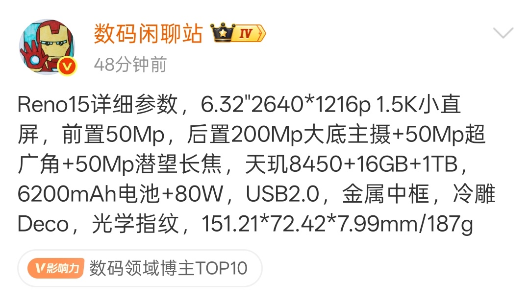 Reno 15配置汇总:6.32英寸1.5K直屏+金属中框冷雕一体Deco设计+天玑8450芯片+前置5000像素+后置三摄2亿像素HP5主摄+5000万超广角+5000万潜望长焦+6000mAh电池+80W+IP68/IP69级防尘防水+USB2.0。你们觉得这配置咋样,定价多少合适?