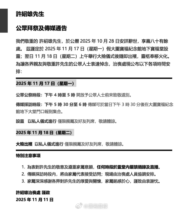 【:感谢大家并公开告别会细节】 11月11日,许绍雄 女儿许惠菁发文:“感谢大家的关心和温馨留言,知道网上有支持爸爸的朋友们安排了来香港跟他告别,我们一家都很感恩大家对他的爱护,再次感谢大家对我爸爸的爱和支持,他永远在我们心中。”许惠菁同步公开许绍雄告别会细节,公众可于11月17日去纪念馆送别许绍雄,许绍雄遗体将于11月18日出殡。