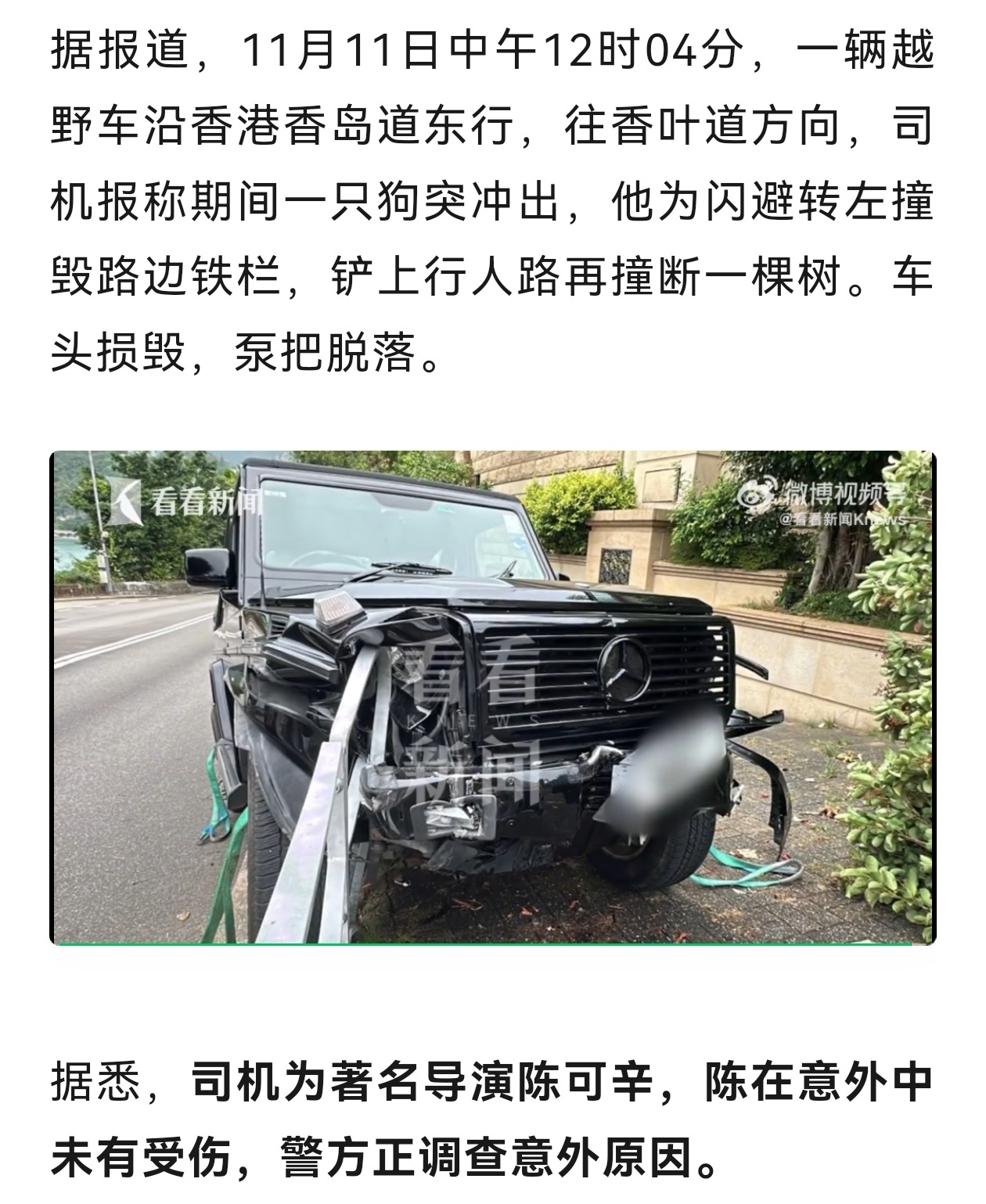11月11日中午,中国香港知名导演陈可辛驾驶一辆奔驰G-Class越野车,在香岛道东行途中为避让突然冲出的一只流浪狗,急转方向导致车辆失控,撞毁路边铁栏后冲上人行道,并撞断一棵约两米高的树。事故造成车头严重受损,保险杠脱落,零件散落一地,但陈可辛本人未受伤,事后他站在路边用手机求助并报警,警方到场后封锁现场展开调查。目前,陈可辛已处理完相关事宜并离开现场,由一名女助理协助善后。陈可辛因避狗导致车辆失控,所幸人未受伤,警方已按一般交通意外立案,责任认定尚待调查,从报道来看,陈可辛无酒驾、毒驾或超速等违法情节,现场也无其他车辆、行人受伤,属于典型紧急避险情形,涉事车辆如购买全险的话,栏杆、车辆等损坏,正常走保险流程即可,无需过度解读。