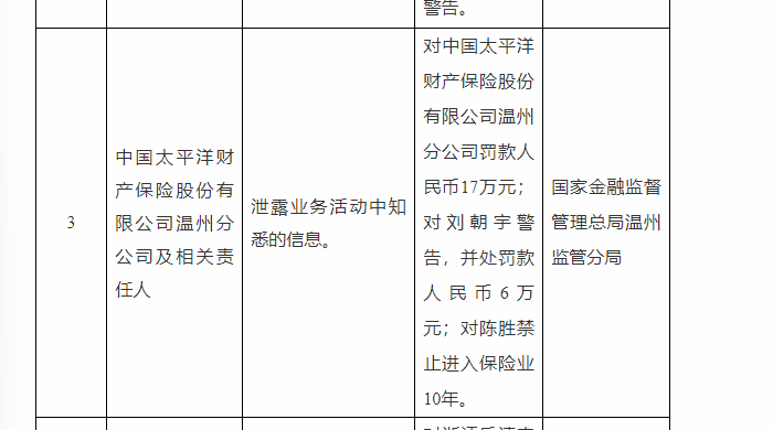 此外,在本批罚单中,中国太平洋财产保险温州分公司及相关责任人也受到处罚。国家金融监督管理总局温州监管分局指出,该公司因存在泄露业务活动中知悉的信息问题,对其罚款17万元;对责任人刘某宇给予警告处罚,并罚款6万元;另一位责任人陈某被禁止进入保险业10年。