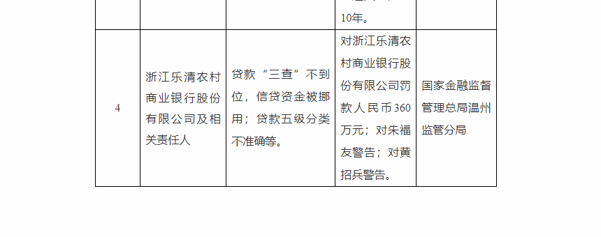 浙江乐清农村商业银行则因存在贷款“三查”不到位,导致信贷资金被挪用、贷款五级分类不准确等违法违规问题,被国家金融监督管理总局温州监管分局罚款360万元,是本批罚单中被罚金额最高的金融机构。