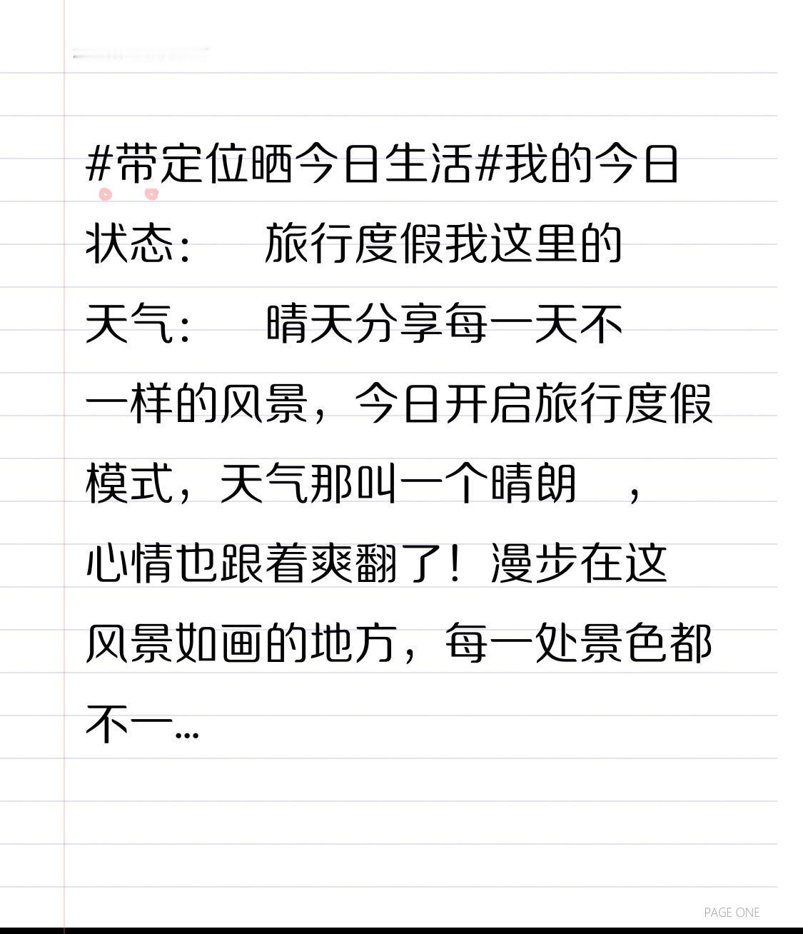 我的今日状态:🏝️旅行度假 我这里的天气:☀️晴天分享每一天不一样的风景,今日开启旅行度假模式,天气那叫一个晴朗☀️,心情也跟着爽翻了! 漫步在这风景如画的地方,每一处景色都不一样,仿佛置身于梦幻之境。阳光洒在身上,暖烘烘的,别提多惬意了。 一路上,感受着清新的空气,欣赏着周边的美景。这时候才发现,生活的美好就藏在这些旅途中。我要好好享受这难得的时光,把每一天不一样的风景都装进记忆里,让快乐永留存。 我在家乡晒风光 旅游心情记录 我在景区自拍 随走随拍旅游 度假小记 旅游生活日志
