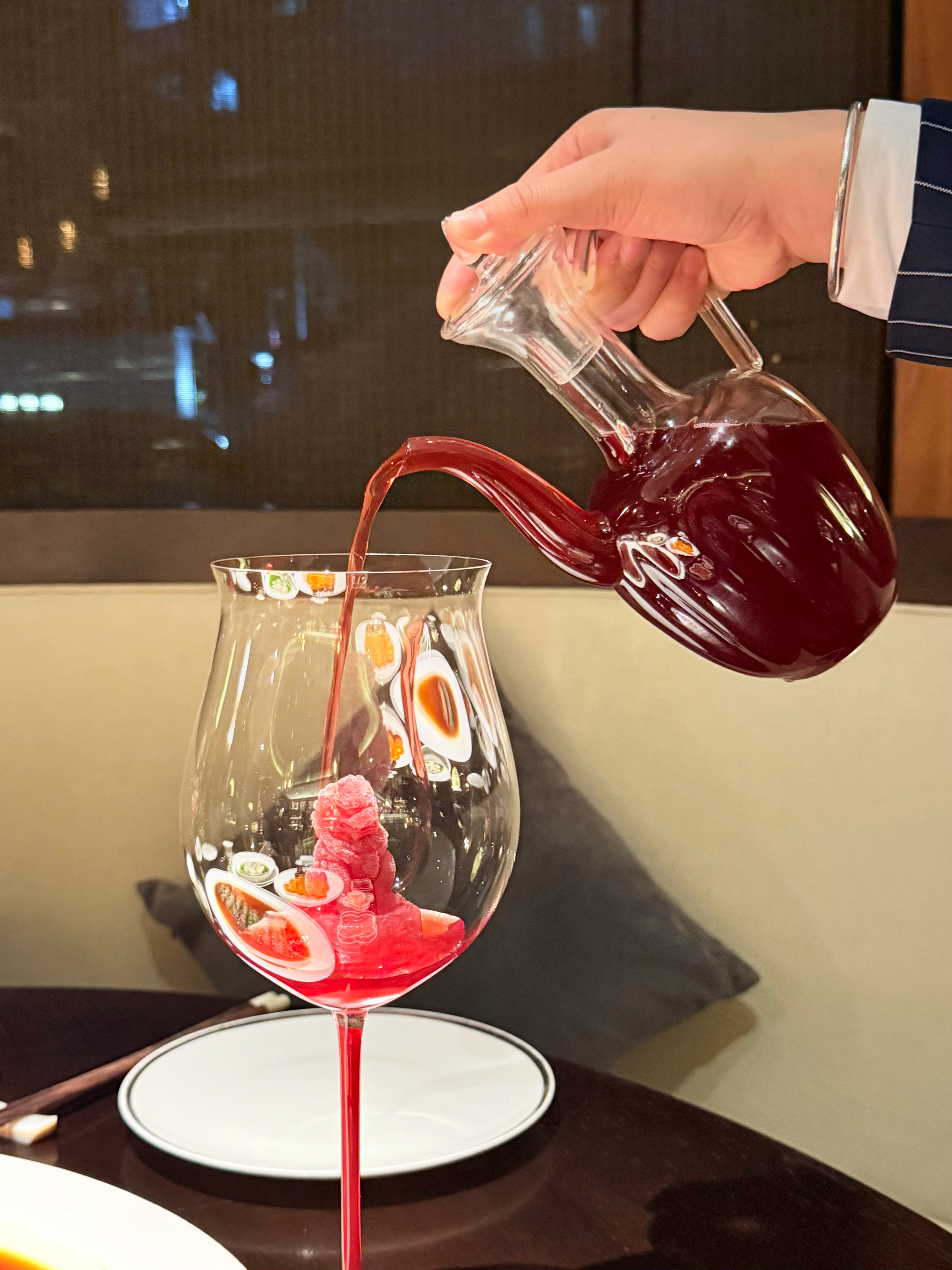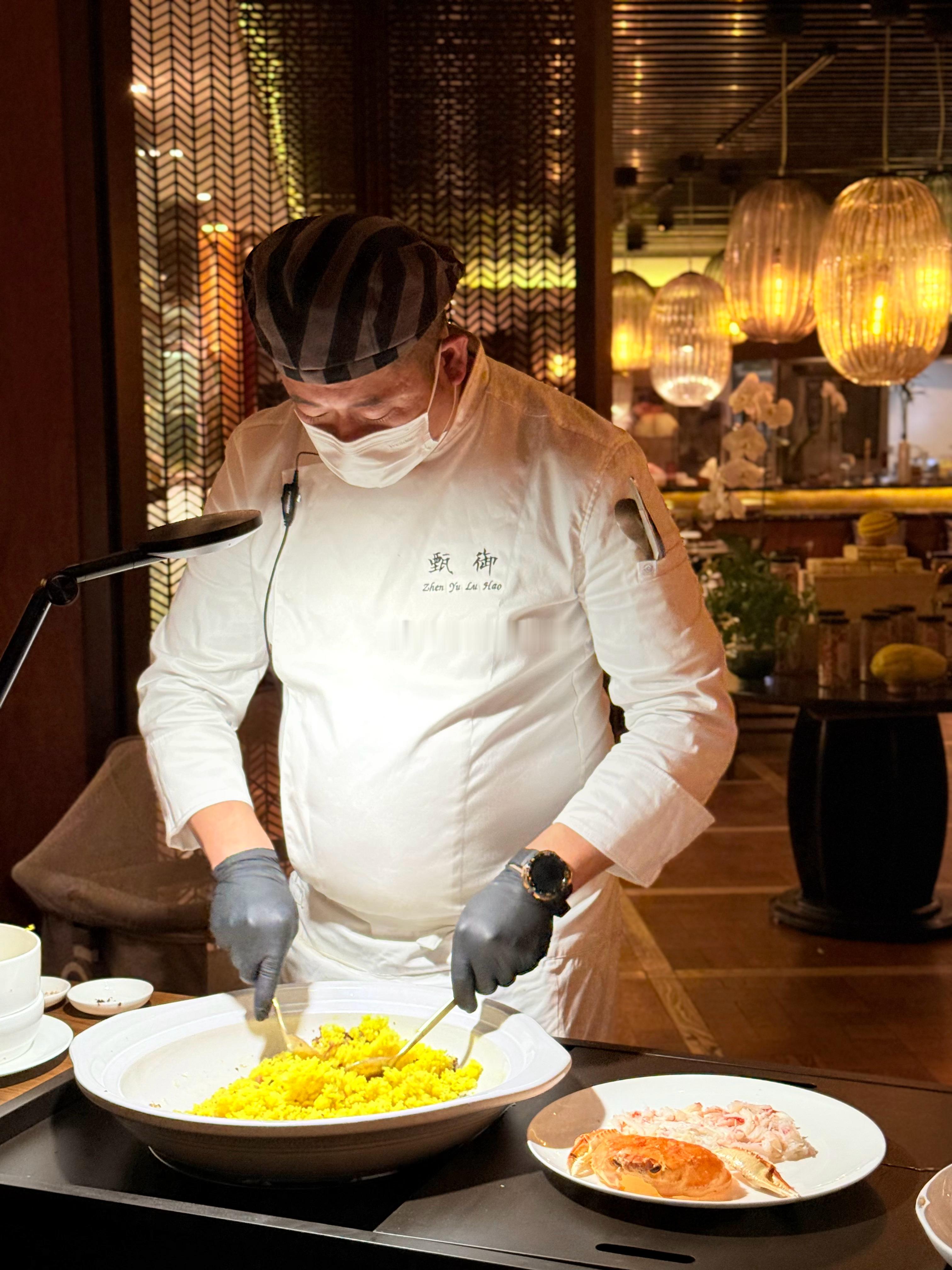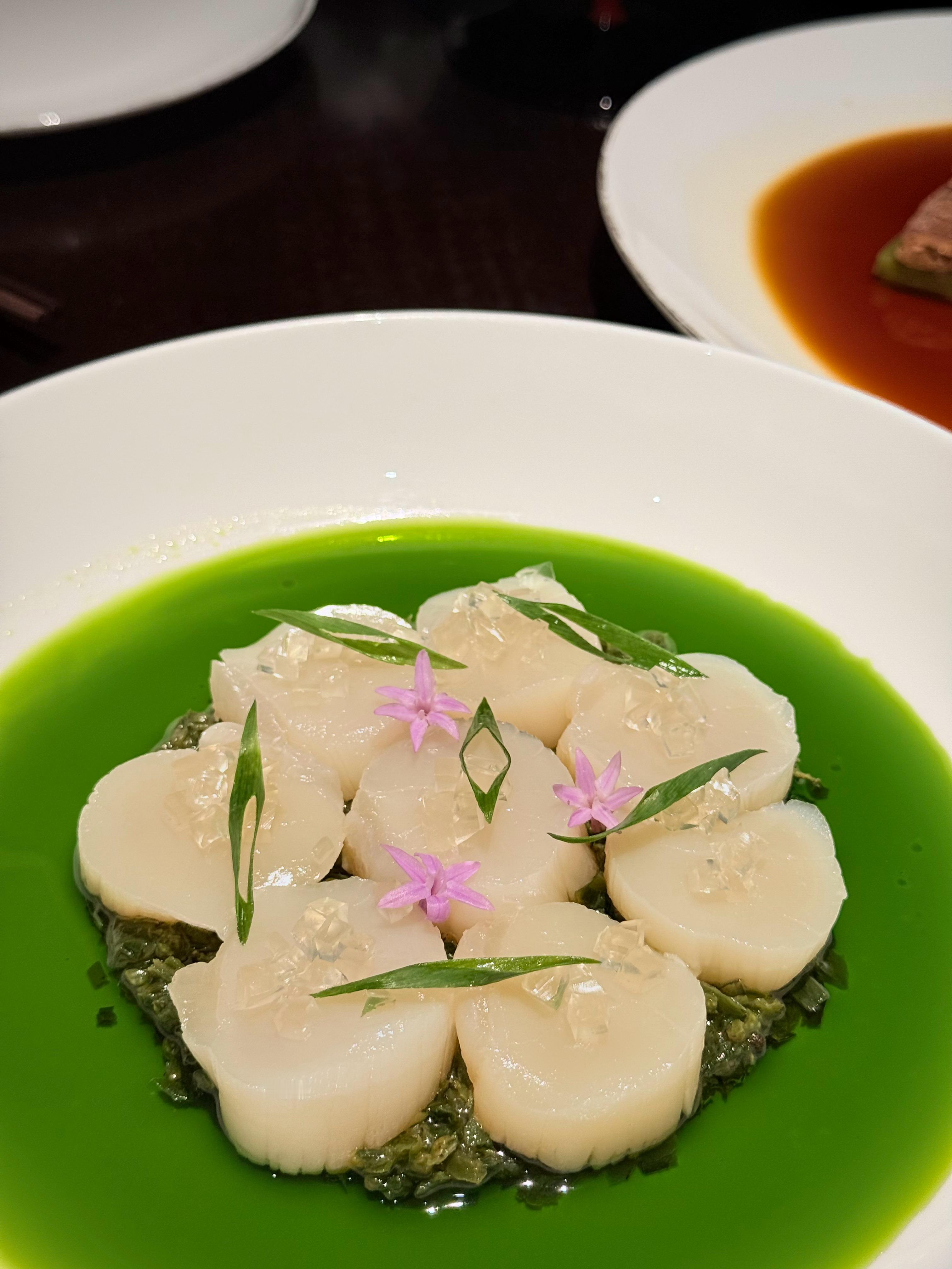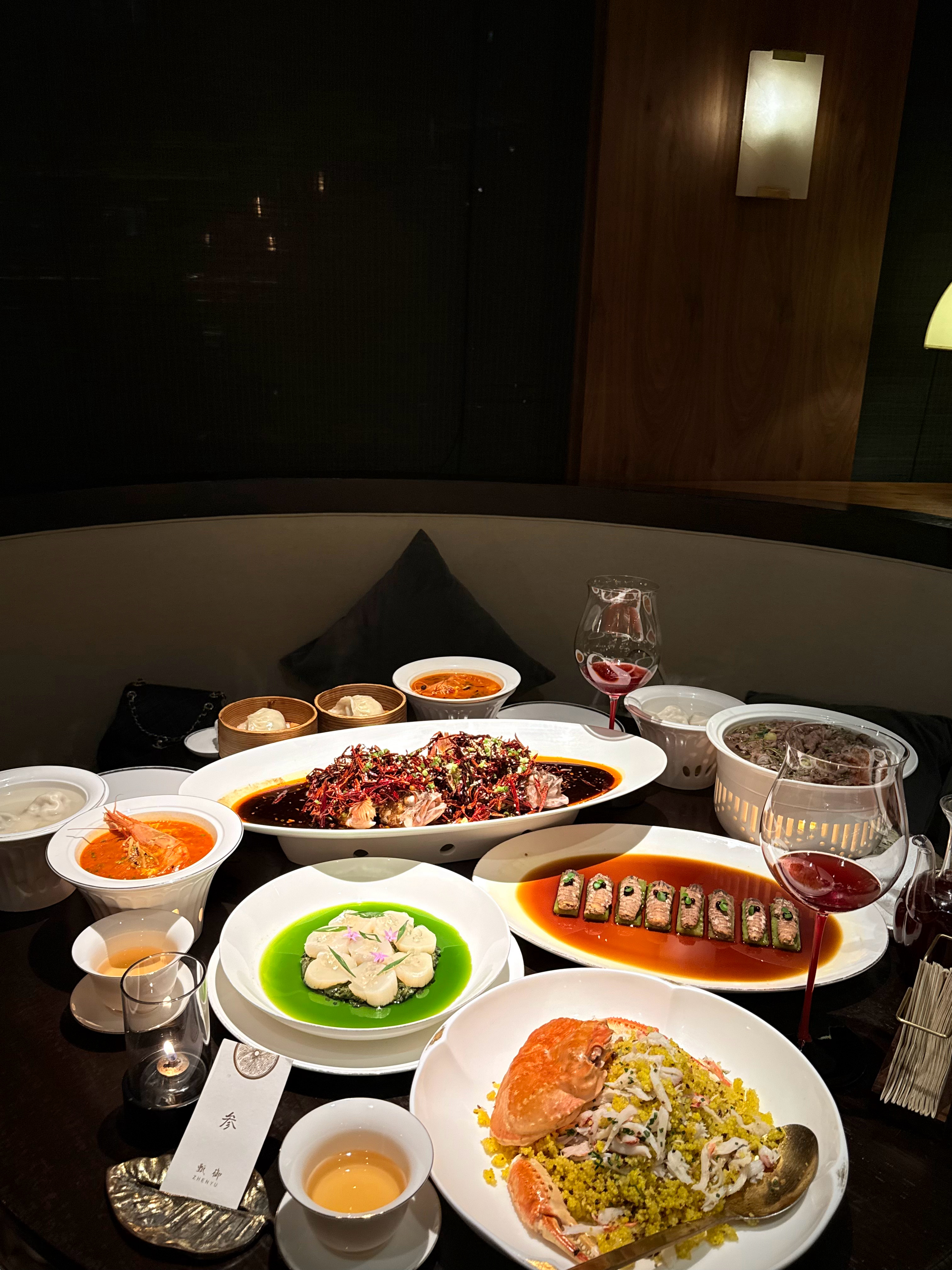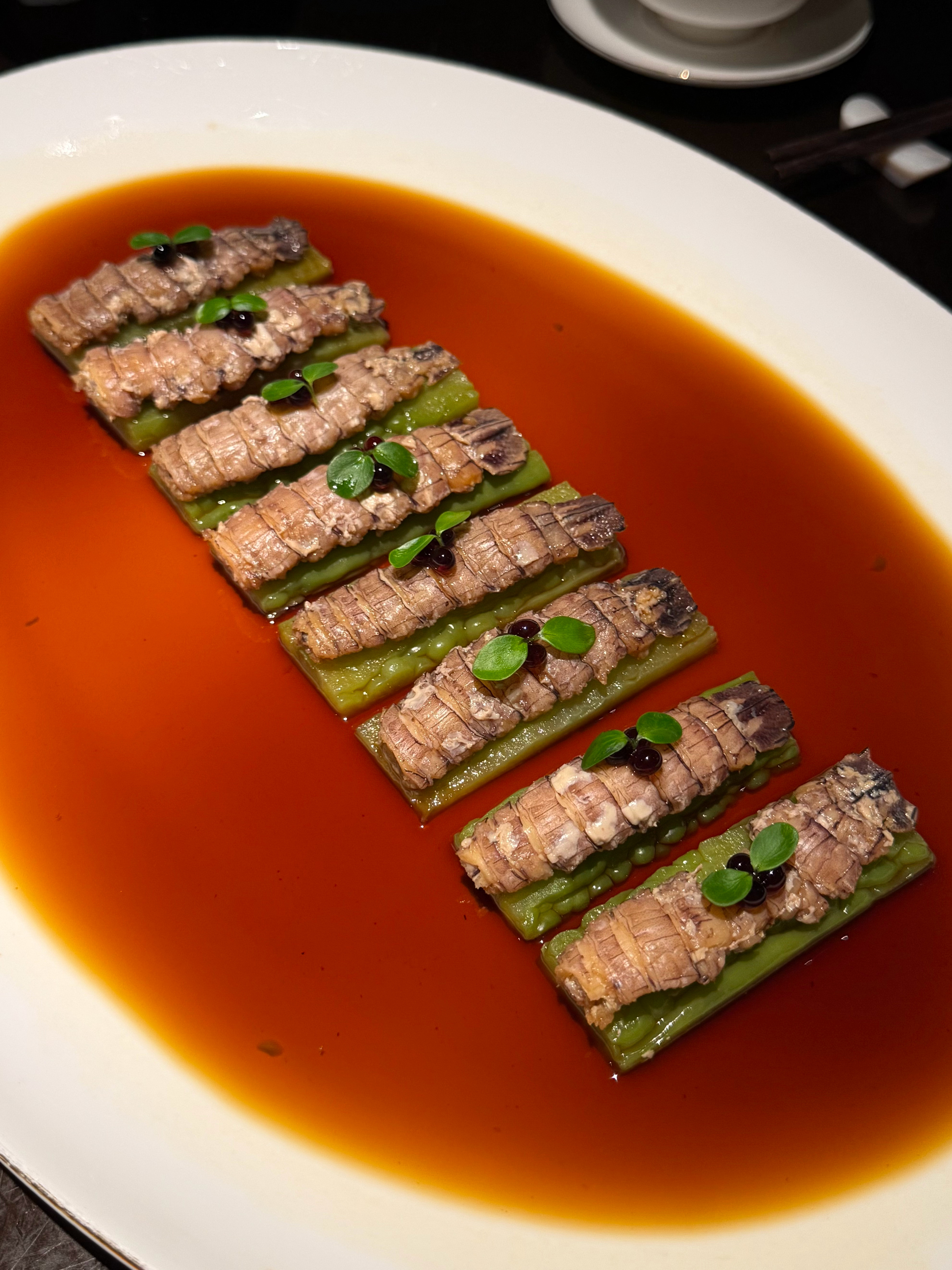 来青岛第一顿✌️当然要吃漂亮饭✨本地朋友说“来青岛不吃这桌,等于白来”——推门暗金氛围裹满圆桌边位,直接把仪式感焊在餐桌上。这才是新青岛菜的魂:崂山泉水牛腱心薄切透光,筋肉裹着琥珀汁脆弹回甘;椒麻低温澳带像海味艺术品,嫩腴里裹着藤椒酥麻;火麒流我还是第一次尝试,青岛独一份活鱼现做,热油泼葱香裹紧紧实鱼肉,连皮都浸满辣鲜。主食我推荐松叶蟹炒金黄小米🦀松叶蟹手工拆肉搭配金米炒香裹鲜甘。服务员分寸感刚好,会为我们介绍菜品的食材和美好的寓意,仪式感满满❤️这桌“海味美学”,新青岛菜的浪漫全在这了。