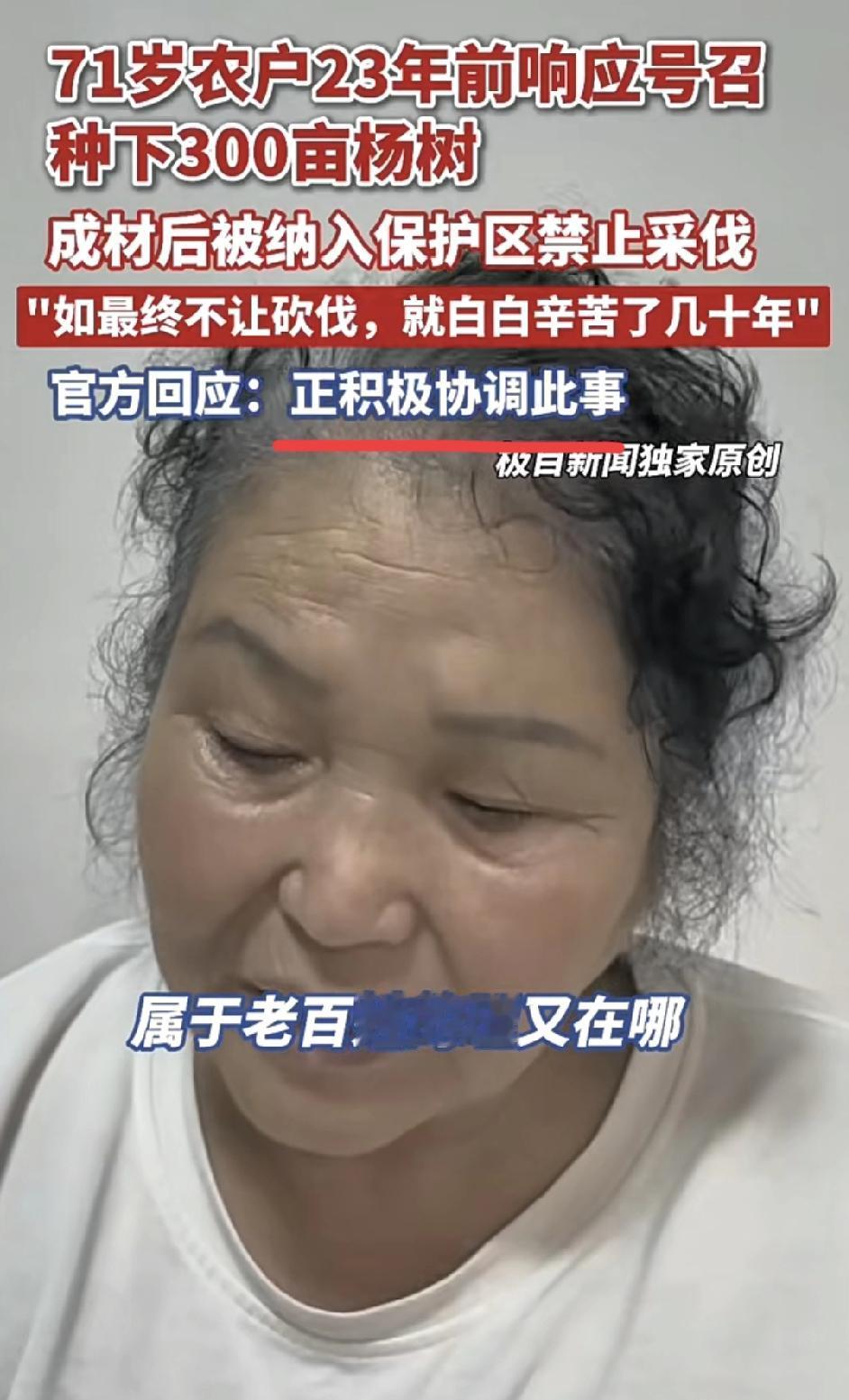 一棵杨树能卖好几百,300亩23龄的杨树得值多少钱啊! 不出意外齐齐哈尔的王大姐已经是大富翁级别了,可现实情况是她一棵树都砍不了,正糟心投进去的100多万要打水漂了! 王大姐的女儿说他们有林权,当时响应号召种杨树,现在提倡保护自然环境,杨树林归了当地保护区,禁止采伐。 “退耕还林”是很重要的生态工程,他们还说这些年没得过任何补助和补偿,那这些钱又去了哪儿呢?! 目前有关部门正在积极调查此事,相信会给王大姐一个合理说法的。