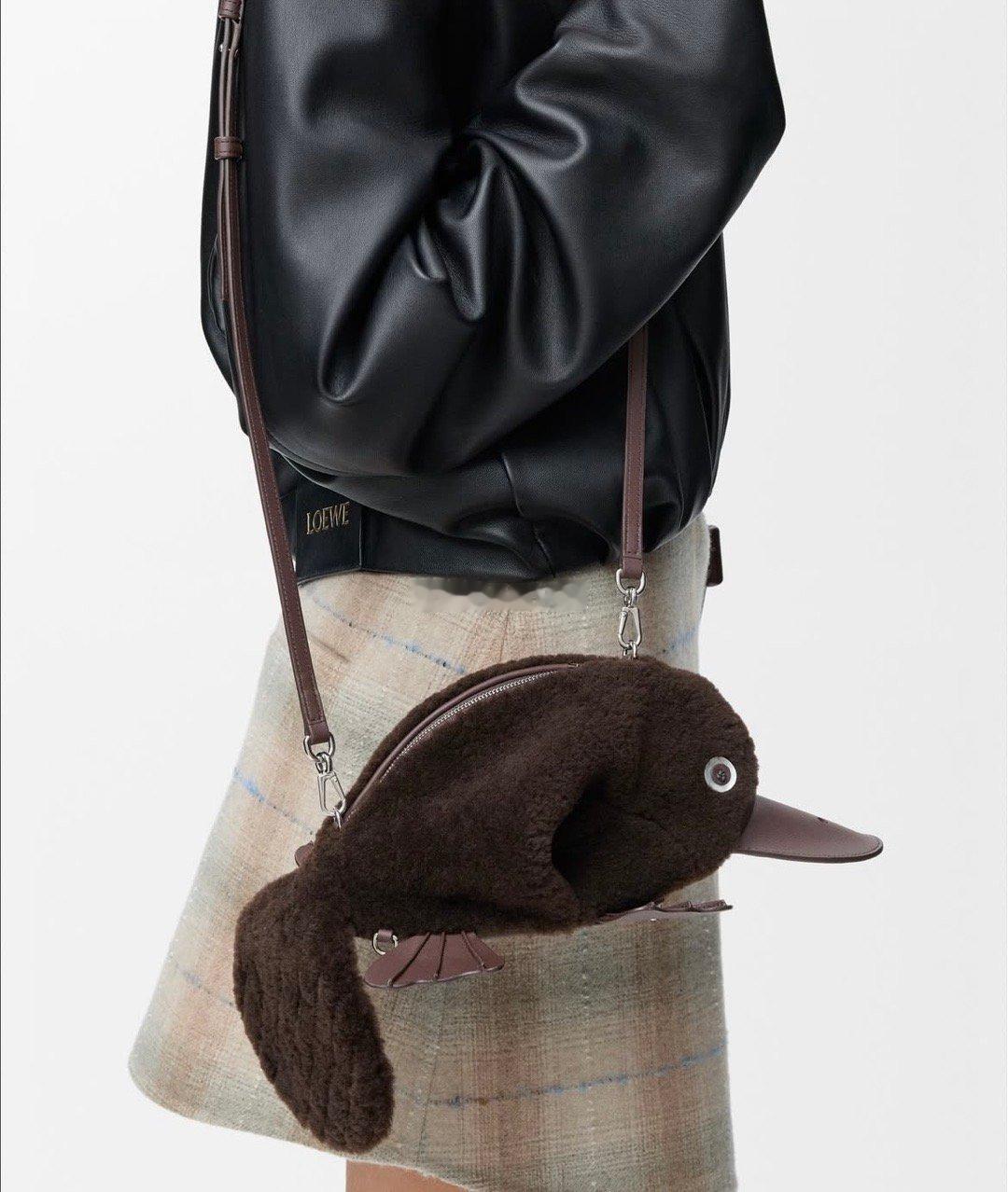 【LOEWE 鸭嘴兽包 治愈上市】谁能拒绝这只从魔法世界里溜出来的小可爱?圆滚滚的身子+无辜大眼睛设计亮点:▫️毛绒绒羊毛混搭光滑小牛皮▫️可调节可拆卸肩带(一包三背太香了)▫️拉链内里安全感满满▫️迷你尺寸意外能装上身效果:斜挎像揣着只温顺小宠物腰包模式瞬间变身奇幻冒险家手拎时鸭嘴兽的呆萌侧颜超级抢镜