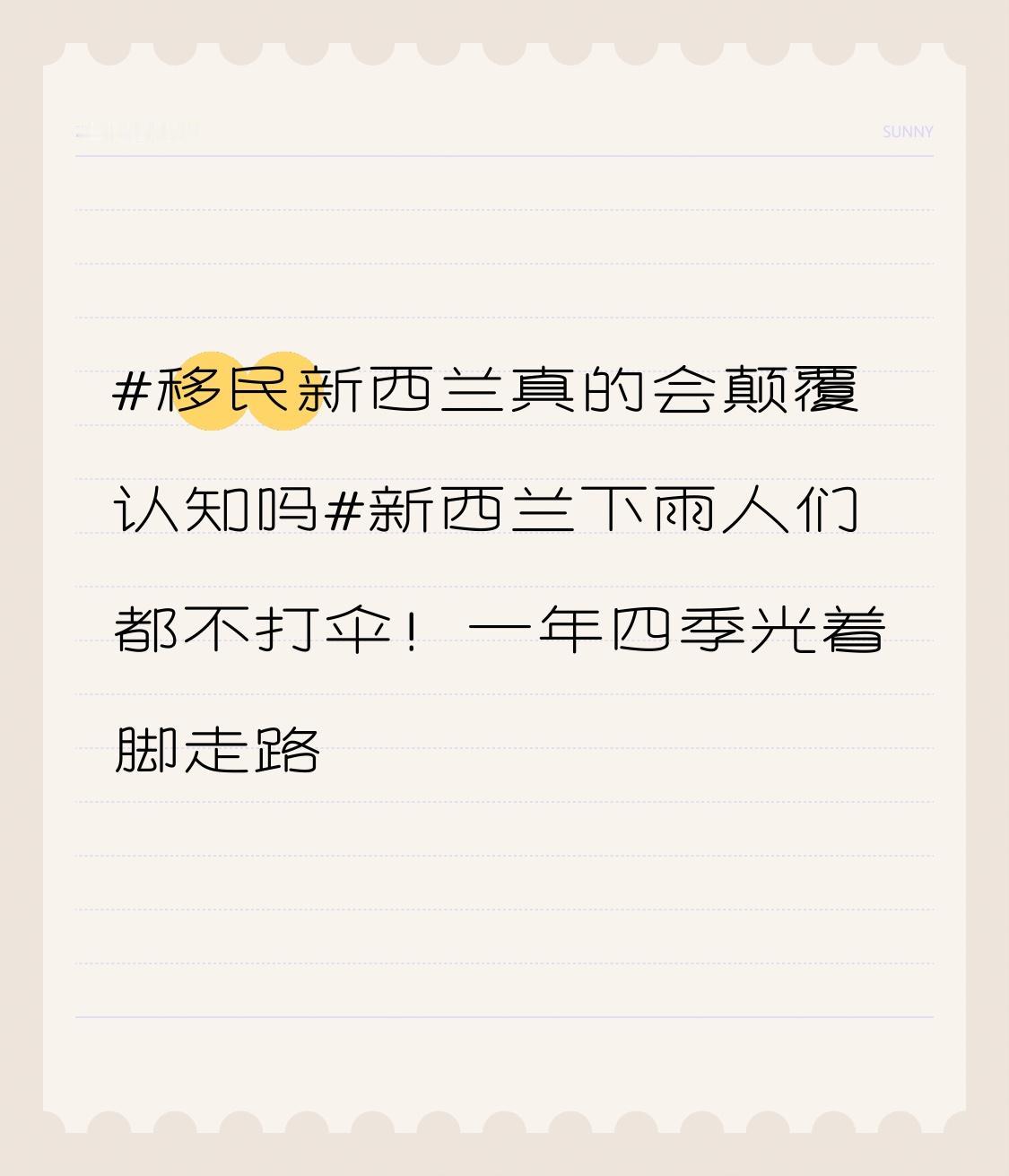新西兰气候温润,很多时候下雨是那种毛毛细雨,雨滴轻柔地飘落,对人们来说,这雨仿佛是大自然温柔的抚摸,不打伞漫步雨中反而别有一番浪漫滋味。而且当地空气清新,雨水干净,就算淋了点雨也不会有什么负担。 至于一年四季光着脚走路,首先是新西兰的环境非常干净,无论是城市街道还是乡间小道,地面都极少有脏污和尖锐的物品,光着脚走也不用担心会划伤或者弄脏脚。其次,这里的气候适合,除了特别寒冷的几天,大部分时间温度都比较适宜,光脚行走不仅不会觉得冷,还能让双脚直接接触大地,感受泥土的绵软、细沙的摩挲、青草的触感,仿佛与大自然更加亲近。 在新西兰生活一段时间后,你会发现当地人这种随性自在的生活方式已经融入到了日常的方方面面。这看似简单的不打伞和光脚走路,其实反映出的是他们对自然的信任与亲近,也让初来乍到的移民逐渐放下了原本那些拘谨和条条框框,开始以一种全新的视角去拥抱生活。