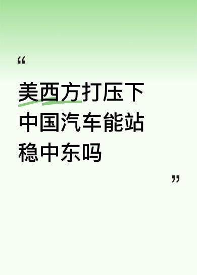 虽说中东乱成一锅粥,但中国汽车在这站稳脚跟还是很有戏的。2024年中国对中东汽车出口量达100多万辆,是2019年的六倍。像沙特、伊朗等国,已成为中国汽车主要销售市场。 很多中国车企还在当地投资建厂,推动产业链完善。比如有巴林人开着中国长安的SUV,对其技术和质量很满意。而且中国汽车性价比高,售后服务周到,还能快速响应客户需求。美西方打压算啥,就凭这些优势,中国汽车在中东站稳妥妥的。