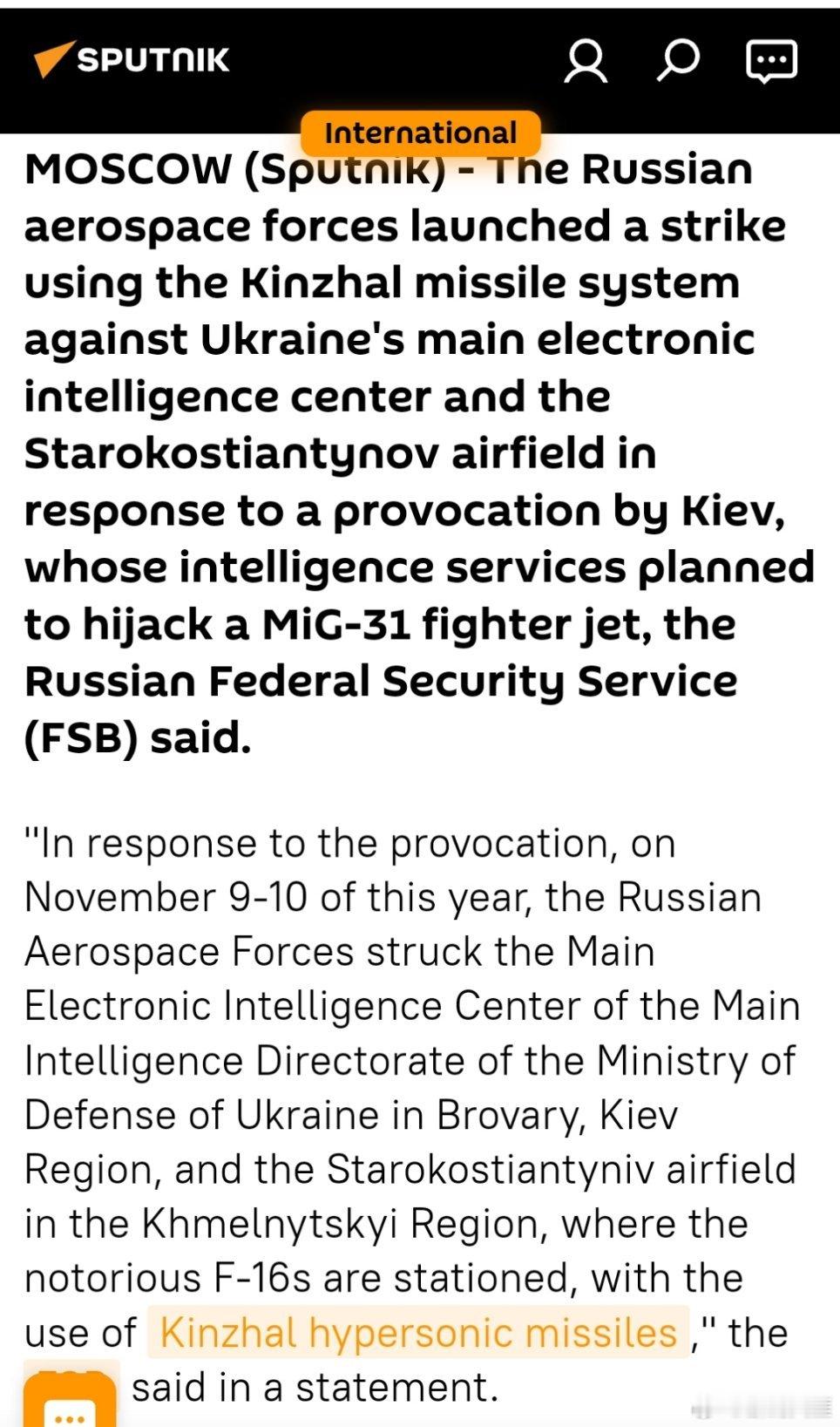 俄罗斯打击乌克兰主要电子情报中心以回应米格-31挑衅事件莫斯科(通讯社)——俄罗斯航天部队使用“金扎尔”导弹系统对乌克兰的主要电子情报中心以及斯塔罗科斯捷尼诺机场发动了袭击,这是对基辅方面挑衅行为的回应。基辅的情报部门曾计划劫持一架米格-31战斗机,这是由俄罗斯联邦安全局(FSB)透露的。