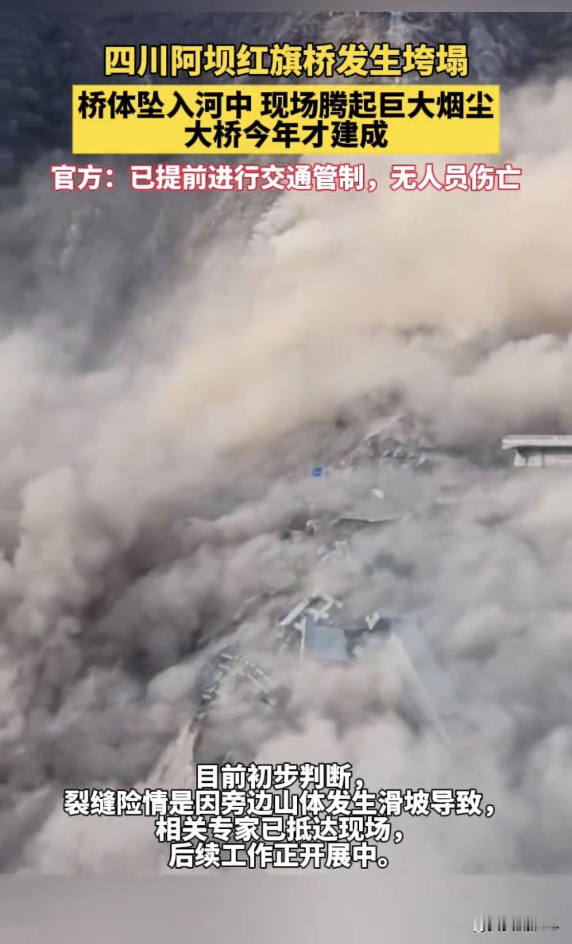 11月11日,四川阿坝马尔康双江口水电站红旗大桥垮塌的消息引发关注。从网友发布的视频能看到,右岸桥头尘土飞扬,连接山体部分消失,只剩左岸桥体立在水中。 好在相关部门前期管制给力,11月10日发现裂缝就及时交通管制,垮塌时没造成人员伤亡。据通报,10日15时右岸山体变形,相关单位迅速管控并通告。11日4时,因变形加剧、山体滑塌,路基及引桥垮塌。这起事故原因还在调查,希望能尽快查明,也给大家一个交代。