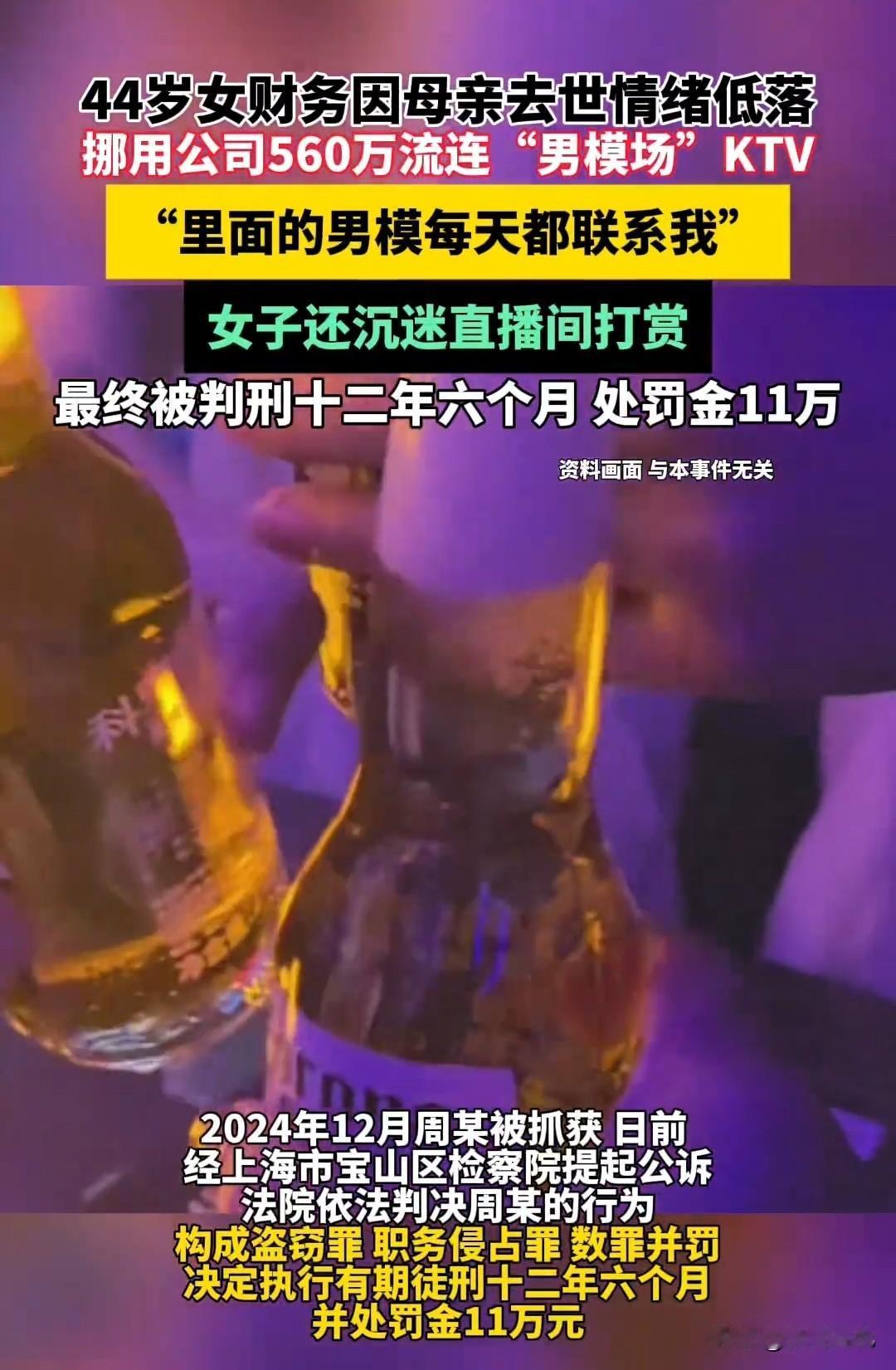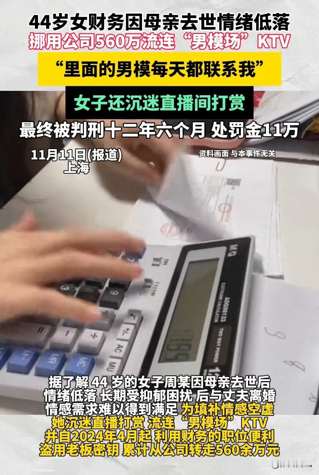 人才!44 岁女财务挪用公款 560 万,流连“男模场”,居然是因为母亲去世,情绪低落,需要填补情感空虚! 上海一位女财务,44 岁中年大姐,因为母亲去世后心情抑郁,后面更因为和老公离婚,导致情感失衡,想方设法填补情感空虚。 于是女子沉迷于直播打赏,流连“男模场”KTV,而这些打赏的钱,居然是她偷偷盗用老板密钥,陆陆续续从公司挪用出来的 560 万 公款! 最终女子被抓获,因犯盗窃罪和职务侵占罪,数罪并罚,判处有期徒刑 12 年半,罚金 11 万。 别的不说,高达 560 万的公款被挪用,公司居然没有一个人察觉?这得是多松散的管理才会出现这样的漏洞呢?没有会计或主管的吗?都不用对账的吗? 女子入职一年,就能挪用几百万公款,只能表明:1、 公司账上钱很多,挪走了几百万还能正常运转?!2、财务管理太混乱了,估计一年下来被挪空也无人察觉吧? 这样的公司,早晚会出事吧?