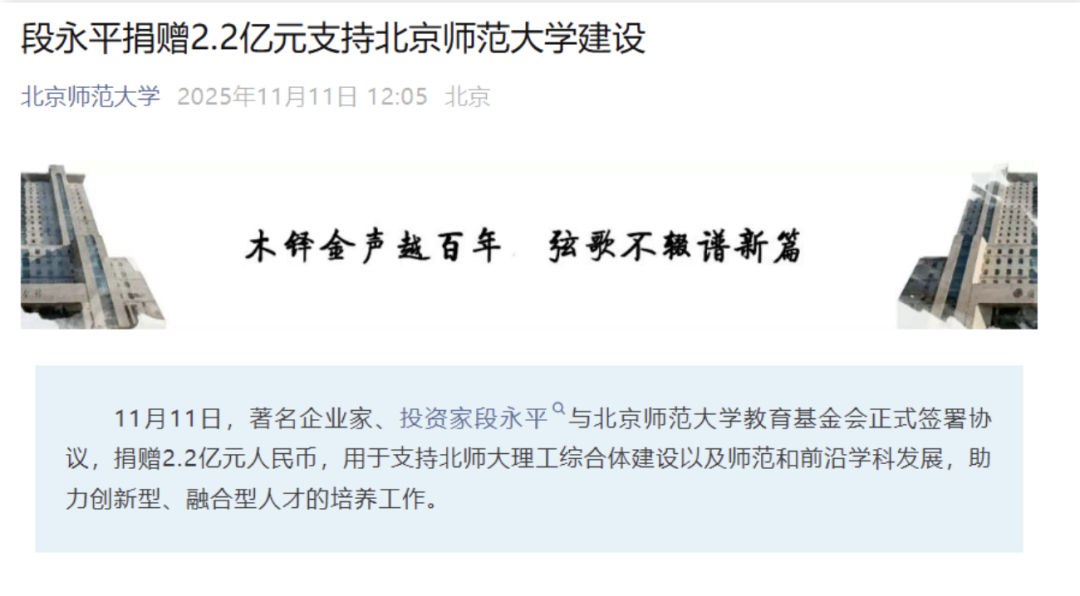 【再捐2.2亿元!段永平又出手了,近期罕见接受访谈,多次提及茅台】 红星资本局11月11日消息,段永平再捐赠。11月11日,北京师范大学发布消息,知名投资人段永平与北京师范大学教育基金会正式签署协议,捐赠2.2亿元人民币。据北京师范大学微信公众号,捐赠将用于支持北师大理工综合体建设以及师范和前沿学科发展,助力创新型、融合型人才的培养工作。为感谢段永平及其母亲彭建华对学校发展的重要贡献,北京师范大学将珠海校区核心教学枢纽理工综合体学术云环冠名为“段永平学术云环”,并将理工综合体图书馆冠名为“彭建华图书馆”。红星资本局注意到,这是继今年10月,段永平给江西水利电力大学捐赠1万股贵州茅台(600519.SH)股票后,再次向大学进行捐赠。在捐款后,段永平还表达了对贵州茅台的信心,他表示:“他们每年花分红就好,市值只是暂时的。”同时,据雪球公众号,段永平10月16日接受雪球《方略》访谈节目时,聊到其个人经历、企业经营、投资理念、公司理解等话题,其中多次提及贵州茅台。对于雪球创始人方三文提及“你觉得抄作业是不是一种可持续的投资的方法?”时,段永平回答称“很难,因为抄作业你是滞后的。你抄老巴(巴菲特)的作业还好,老巴的东西都是透明的,你抄我的怎么抄?我又不公布我的持仓,我买得多买得少,你根本就不知道啊,你比重跟不上。”“你不懂企业确实是很难,不懂企业最好就是不要碰,我非常保守,A股我就只是买了茅台。”事实上,近期段永平多次提及贵州茅台。今年1月,段永平发帖表示:“今天买了腾讯,也买了茅台。”3月,段永平透露:“我们买茅台主要用的是人民币。”6月,段永平继续发帖鼓励茅台投资者:“对贵州茅台,大家在害怕什么呢?有点意思!”10月13日,段永平在社交平台上发布简短消息,称“今天买了点茅台!”