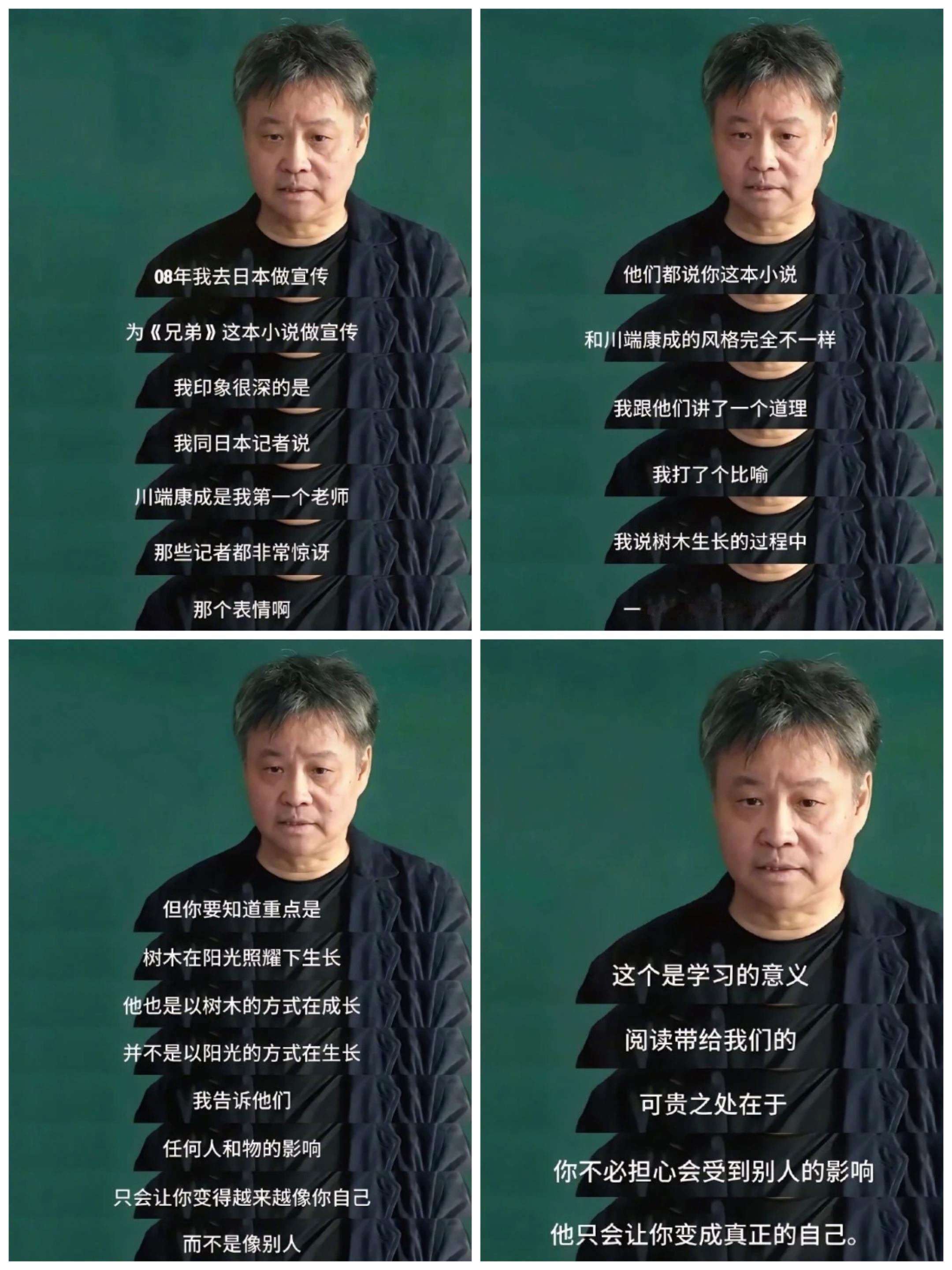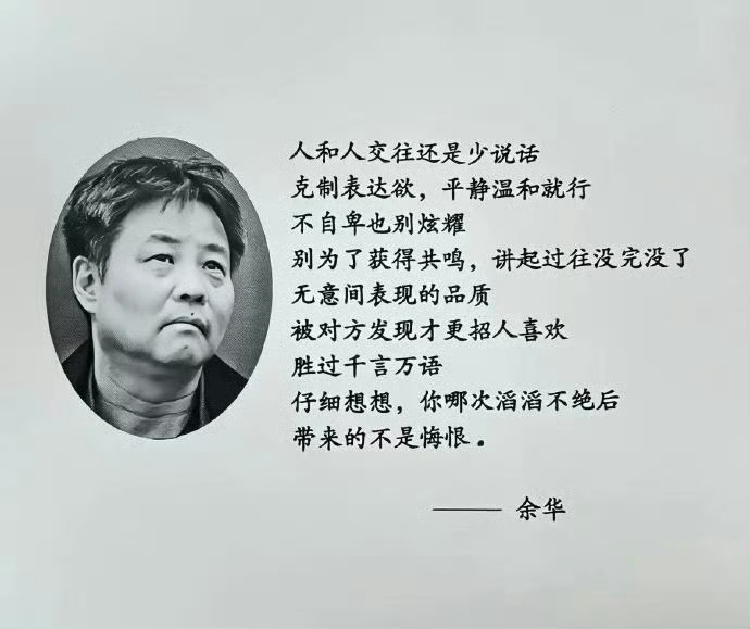 余华真的好会比喻,他真的人间清醒,有些道理就是懂得人就懂,不懂的人需要自己去悟,余华你知道你这句话救了多少人吗?我喜欢他的作品,也喜欢他的人品。余华的作品火,来自他对命运和际遇的真实刻画;余华人品火,则来自他的真实和人间清醒。余华曾说:“有些读者看到我的书,以为我早就死了,其实我没死,我还活着,不仅如此,我还靠《活着》活着。”关于余华的经典语录,或随口说的段子,真的数不清,一点也不装。【来对了】余华:第一天上班的时候,我故意迟到了两个小时,结果发现我是第一个到的,我觉得,这个单位我来对了。【童年】记者:你的童年幸福吗?余华:我的童年嘛,因为不用上学,肯定是幸福的。【区别】记者:在您看来,中国作家和法国作家最大的区别是什么?余华:法国作家用法语,中国作家用中文。【朴实无华】余华:后来评论家都夸我,说我言简意赅,朴实无华,其实,我只是认识的字少。【足球】余华:后来我和莫言、刘震云,把史铁生扛到火车上回学校,正好碰上足球赛,于是我们把史铁生放在守门那里,跟人说,你们要是把球踢到史铁生身上,可能会把他给踢死,于是谁也不敢把球往那边踢。【反内卷的朋友】余华:我有个朋友从来不用微信,我问他为什么,他说他工作时间只有三四个小时,有了微信之后,二十四小时都在上班。【坏习惯】记者:你有什么坏习惯?余华:我之前和莫言一个宿舍,他读任何书都是坐着,我看书都是躺着,白天就躺在沙发上,我现在去他的写字室去,发现他还是保留了他过去的那个阅读的习惯,而我只有写字的时候才会坐在椅子上,现在我连这个坏习惯也改了,我现在写东西也是躺着。【弃医从文】余华声称,自己跟鲁迅一样——弃医从文,从5年经验的老牙医转行成了作家,原因却不是救国救民,而是想早点下班。余华老师,用作品告诉我们“要活着”,又用段子告诉我们,还可以有这种坦荡的活法。