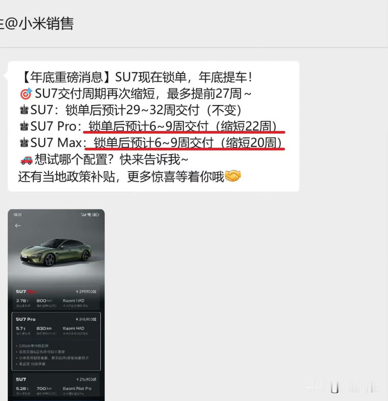 小米su7交付时间突然缩短至6-9周,10月份只交了1.49万台,创新低,但是su7Pro和max交付时间突然缩短至6-9周,从原来的30周突然变成6-9周,25年都有可能提车了这落差令人震惊。