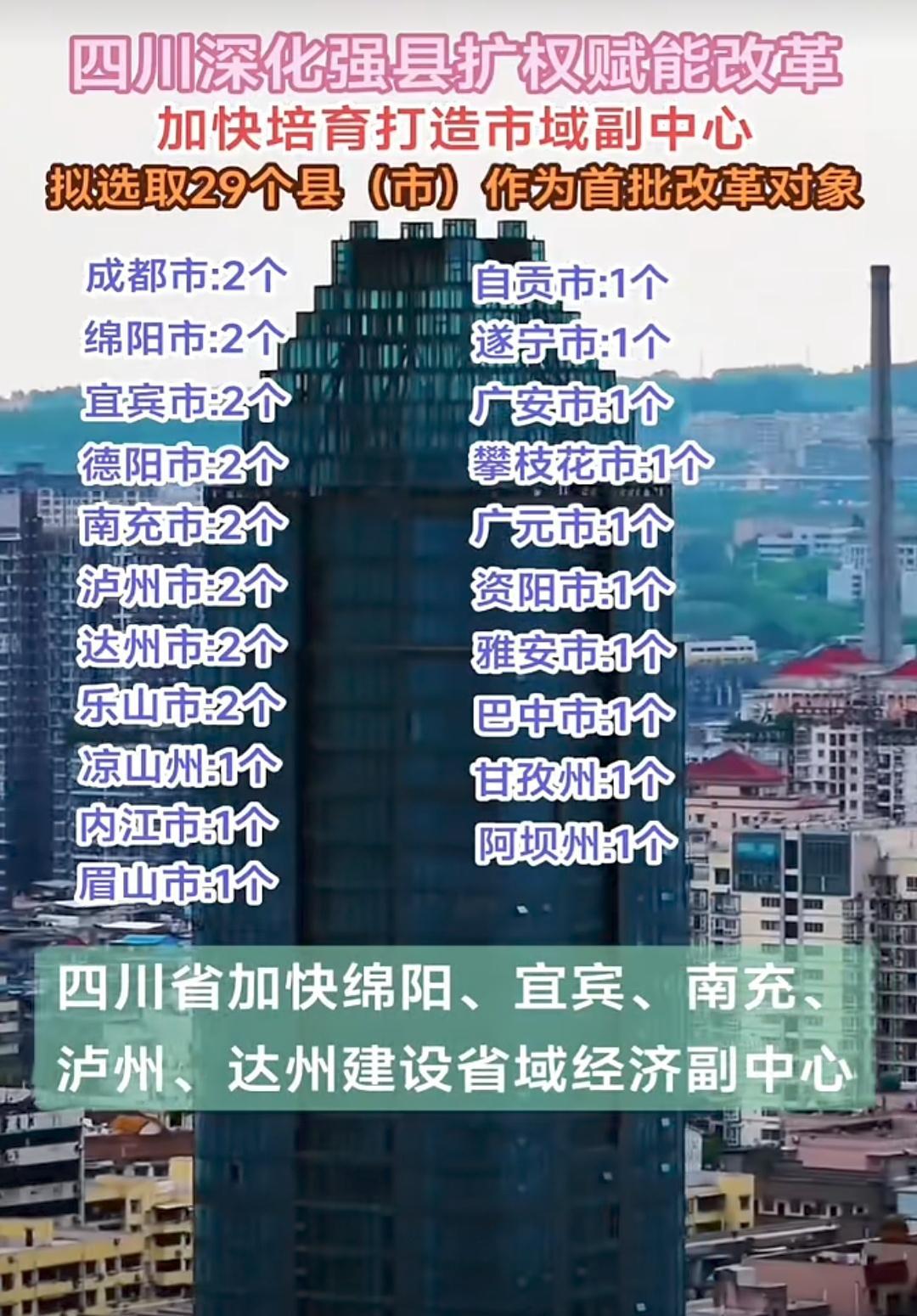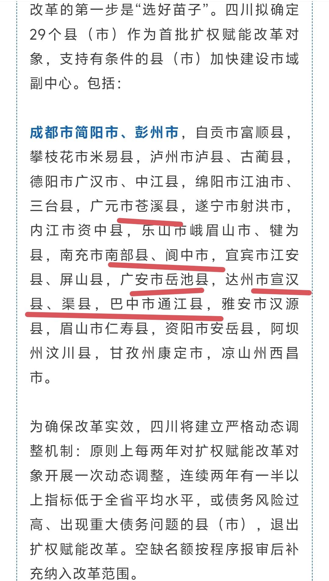 四川深化强县扩权赋能改革来了,首批共选取29个县市作为培育对象,加快培育市域副中心城市,川东北区域中,如达州的宣汉渠县,南充的南部阆中广元的苍溪,广安的岳池都是经济前列入选首当其中,而巴中的通江入选是因为什么呢(巴中的县域经济首位是平昌)?值得一提的是阆苍南同时入选,可以作为嘉陵江中上游区域一体化发展示范城市,这也是阆苍南一体化发展的机会!