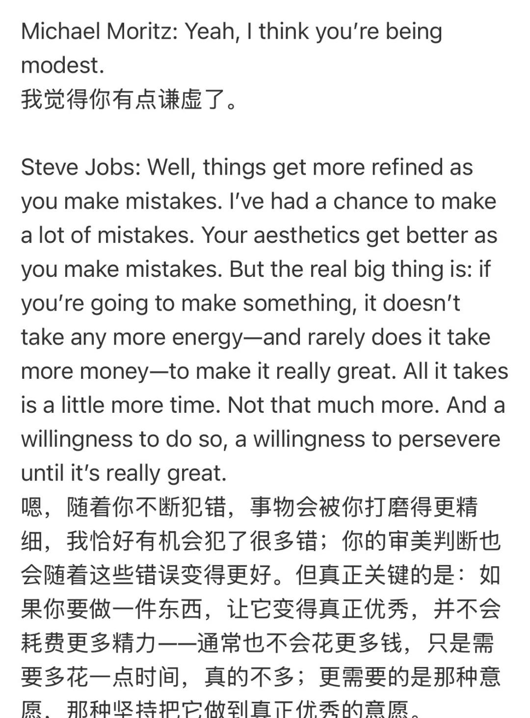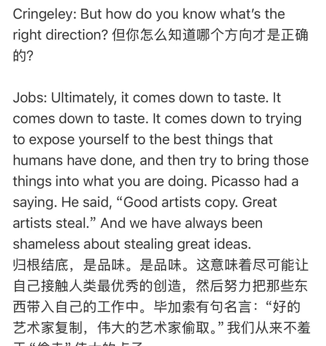 杨振宁和乔布斯谈taste “在每一个有创造性活动的领域里,一个人的taste,加上他的能力、脾气和机遇,决定了他的风格,而这种风格反过来又决定他的贡献。”“taste和风格之于科学研究,就像它们对文学、艺术和音乐一样至关重要,这其实并不是稀奇的事情。” —杨振宁 但你怎么知道哪个方向才是正确的?归根结底,是品味。是品味。这意味着尽可能让自己接触人类最优秀的创造,然后努力把那些东西带入自己的工作中。毕加索有句名言:“好的艺术家复制,伟大的艺术家偷取。”Good artists copy. Great artists steal.我们从来不羞于“偷走”伟大的点子。我认为麦金塔之所以伟大,其中一部分原因是做它的人是音乐家、诗人、艺术家、动物学家、历史学家,同时他们恰好也是世界上最好的计算机科学家。如果不是做计算机,这些人也会在其他领域做出惊人的成就。他们把这种广阔的、人文气息浓厚的自由艺术态度带入了这项工作,我们都想把那些领域中最好的东西吸收过来注入计算机领域。而如果你视野太狭窄,是不可能形成这种品味的。 我并不认为自己的审美品味比大多数人高明多少,真正的区别在于,我会非常执着地把事情做到我们都知道它本可以达到的那个最好状态,仅此而已。嗯,随着你不断犯错,事物会被你打磨得更精细,我恰好有机会犯了很多错;你的审美判断也会随着这些错误变得更好。但真正关键的是:如果你要做一件东西,让它变得真正优秀,并不会耗费更多精力——通常也不会花更多钱,只是需要多花一点时间,真的不多;更需要的是那种意愿,那种坚持把它做到真正优秀的意愿。 很多时候taste需要不断练习和理解 杨振宁 乔布斯