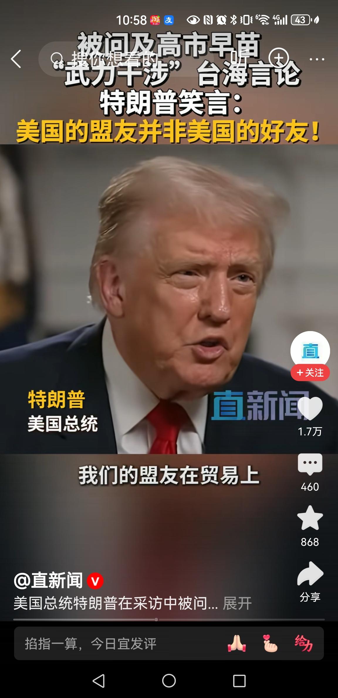 特朗普的这句话,太扎早苗的心💔 特朗普接受记者专访,提到高市早苗的涉台言论 特朗普笑笑说: “我们的很多盟友,也不是我们的朋友。 比起中国,我们的盟友在贸易上,占了更多便宜” 想起不久前,特朗普访问日本时,高市早苗极尽献媚讨好之能事,呵呵,太打脸了。 高市早苗听见了吗?日本,在特朗普的心中,只是盟友,不是朋友。 送你两句中国老话: 和中国叫板,你是“螳臂当车,自不量力” 对于美国,不要拉大旗作虎皮!