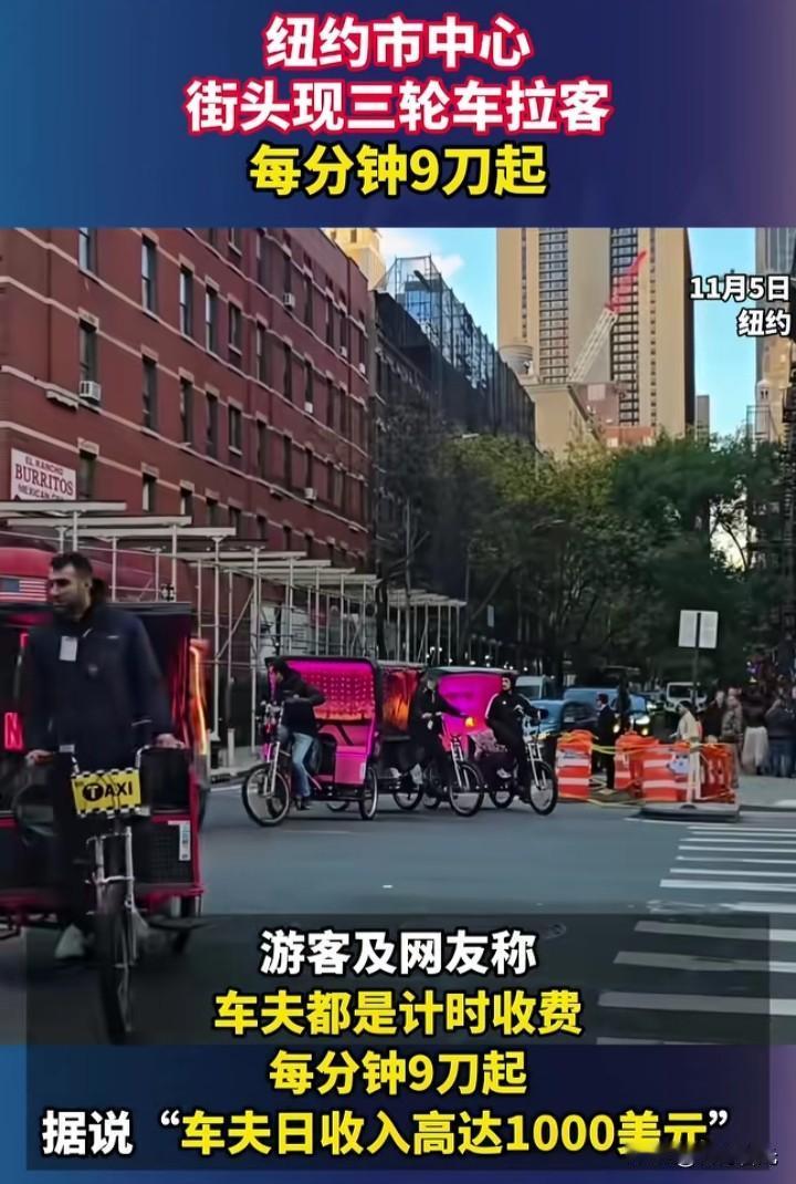 美国,纽约,三轮车! 对,你没看错,是在美国纽约,三轮车拉客。据说,人力三轮车已成为当地城市特色交通工具之一,每分钟9美元,有人最高一天收入达1000美元。 这是咋了,是玩不动高铁地铁了,还是资本家老爷累了?(图片来自网络侵删)
