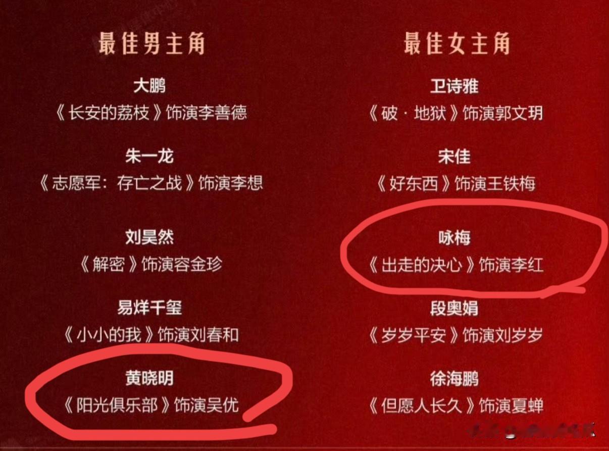 这届金鸡奖 最佳男主角我猜黄晓明 原因很简单,因为其他几位提名的电影都是去年上映的,今年上映被提名的就只有黄晓明的《阳光俱乐部》。夺奖大热门的《日挂中天》,《酱园弄》都没见影子。 名单公布出来,看着就太明显了,这待遇章子怡都没有,黄晓明已获二封,再拿一次也是实至名归。 女主角的话,可能就是咏梅和宋佳的最终较量。