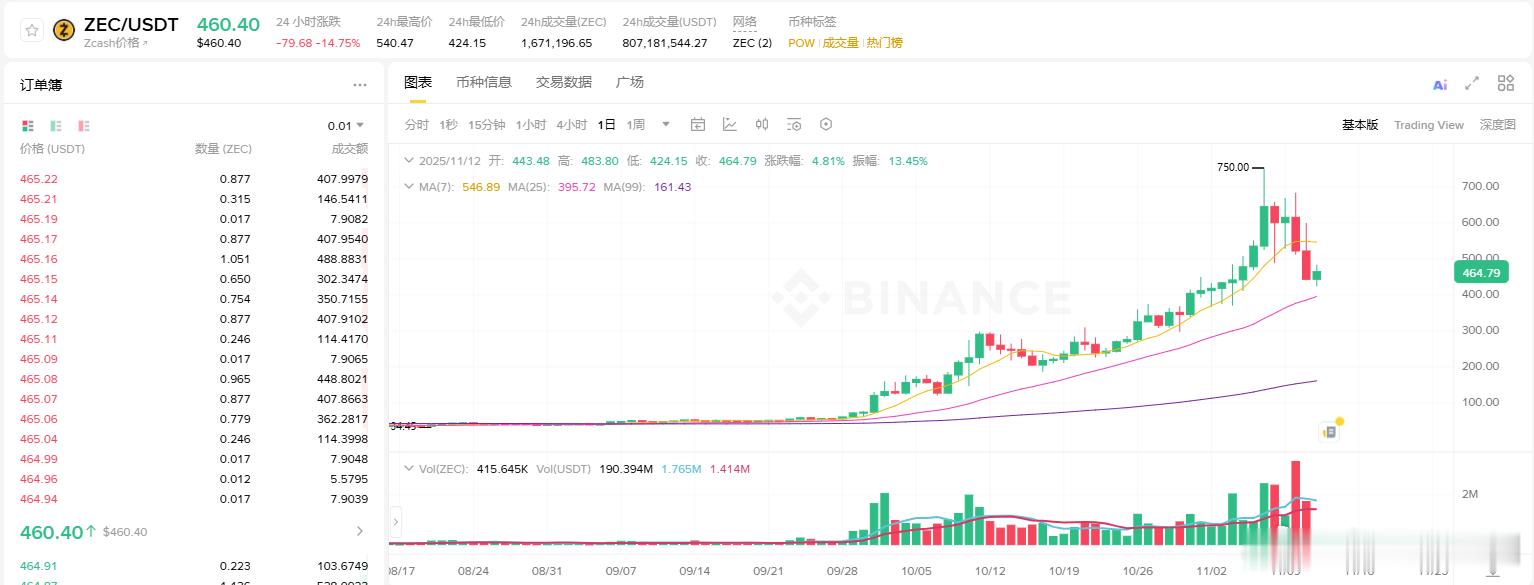 ZEC从日线级别来看,近期K线3连阴下跌,目前已跌破短期均线,刚好精准回踩趋势线附近,且下方有MA30支撑,同时又是整数关口,因此短期回调就关注400大关,若能守住,之后将会去冲击500甚至更高位置,逐渐收复失地