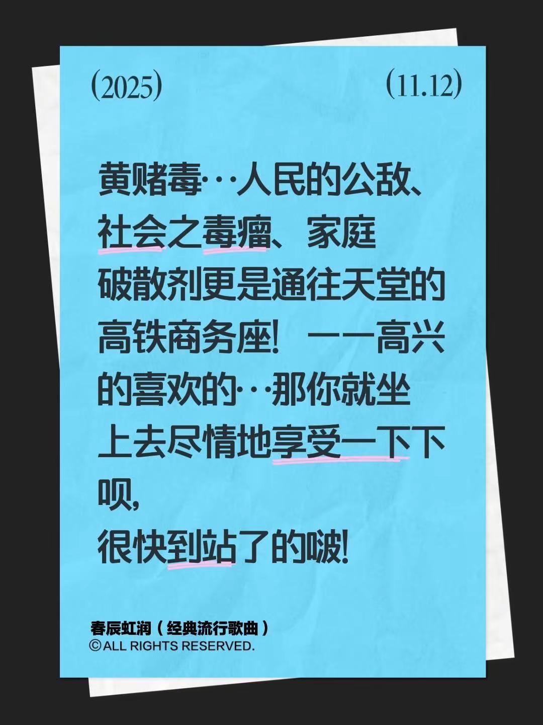 我评论了@我是小召 的作品:黄赌毒…人民的公敌、社会之毒瘤、家庭破散剂更是通往天堂的高铁商务座!——高兴的喜欢的…那你就坐上去尽情地享受一下下呗,很快到站了的啵!